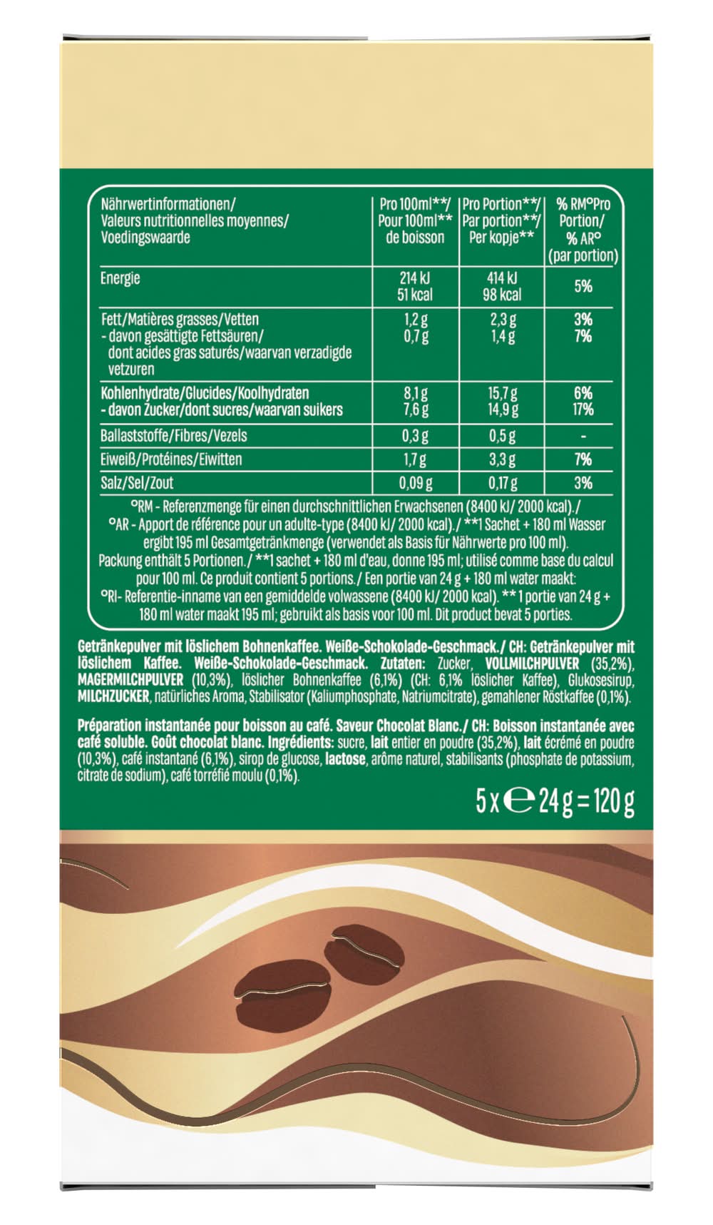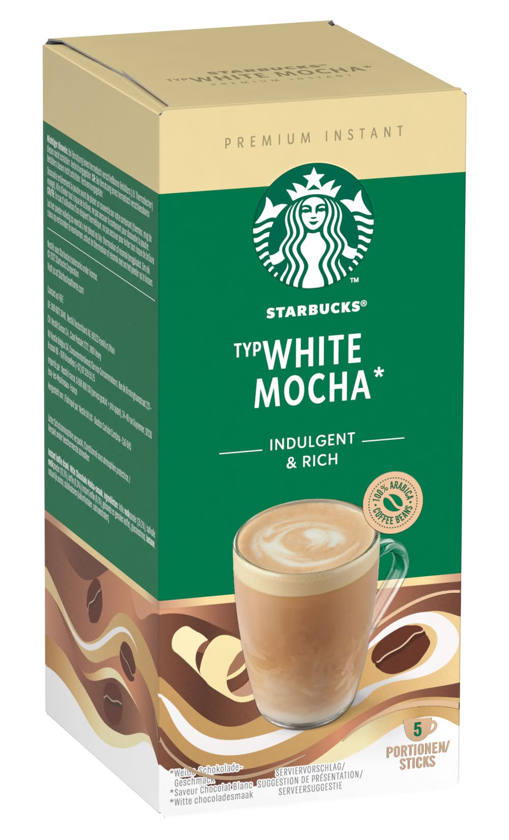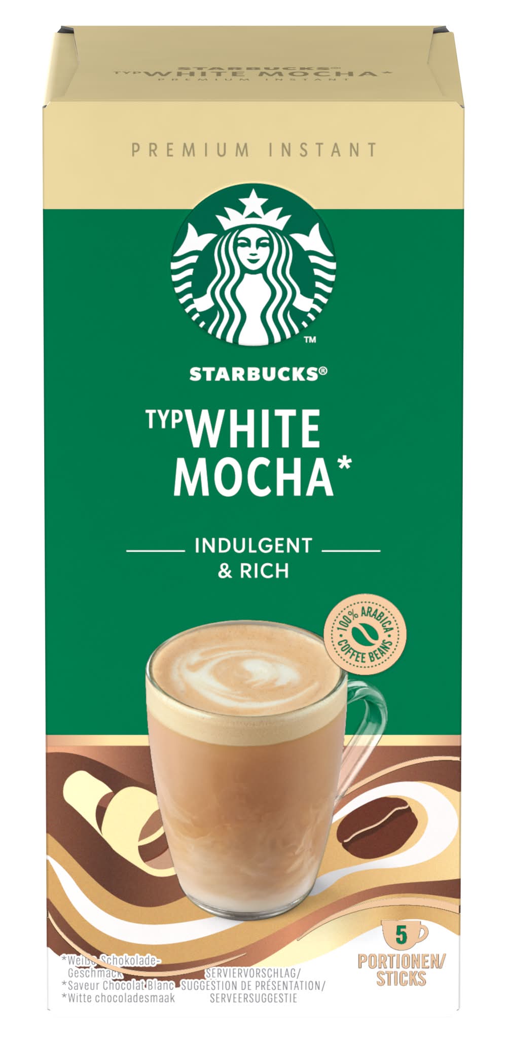 Découvrez STARBUCKS® White Mocha en format sticks : cette délicieuse boisson gourmande allie la finesse de l'Arabica, la douceur du lait, un bon goût de chocolat blanc et une mousse onctueuse et généreuse. Laissez-vous donc tenter par STARBUCKS® White Mocha et profitez de la qualité des coffee shops* STARBUCKS® à la maison !*salon de café. • Nestlé France, 34 40 Rue Guynemer 92130 Issy les Moulineaux • Packaging: Reusable