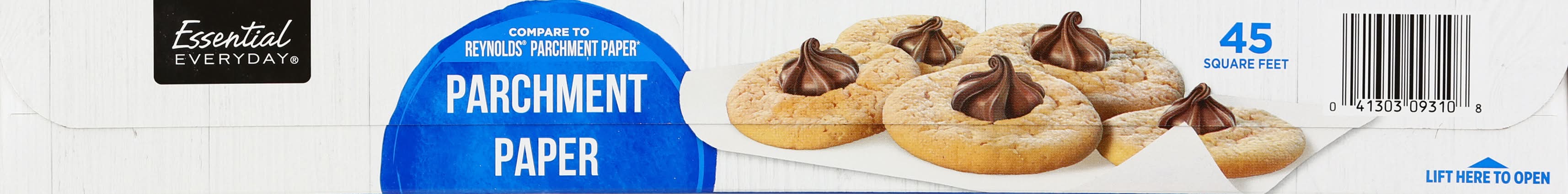 45 sq ft (36 ft x 15 in) 4.18 sq m (10.97 m x 381 mm). Compare to Reynolds Parchment Paper (This product is not manufactured or distributed by Reynolds Consumer Products LLC, owner of the registered trademark Reynolds). Great Products at a price you’ll love - that's Essential Everyday. Our goal is to provide the products your family wants, at a substantial savings versus comparable brands. We're so confident that you'll love Essential Everyday, We stand behind our products with a 100% satisfaction guarantee. Waterproof. Greaseproof. Can be used in a conventional oven up to 400 degrees F, freezer or microwave oven. Line pans and cookie sheets with parchment paper for non-stick baking. Quick cleanup- no need to grease pans! 100% Quality Guaranteed: Like it or let us make it right. That’s our quality promise. 855-423-2630. Essentialeveryday.com. Essentialeveryday.com. Packaged in USA/Product of France. Unfi, Providence, RI, 02908, Ph: 855-423-2630