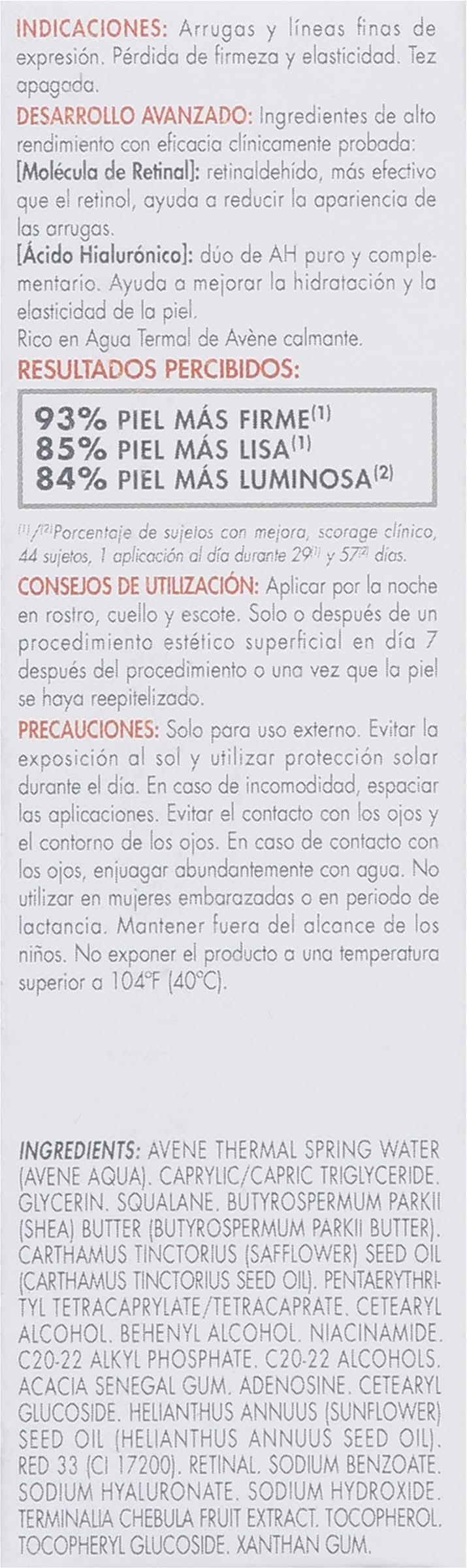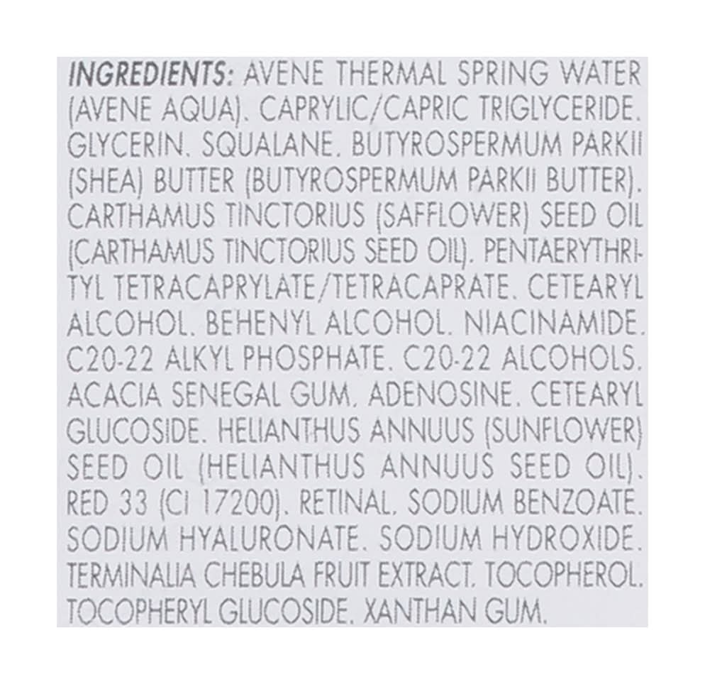 Ingredients: Avene Thermal Spring Water (Avene Aqua), Caprylic/Capric Triglyceride, Glycerin, Squalane, Butyrospermum Parkii (Shea) Butter (Butyrospermum Parkii Butter), Carthamus Tinctorius (Safflower) Seed Oil (Carthamus Tinctorius Seed Oil), Pentaerythrityl Tetracaprylate/Tetracaprate, Cetearyl Alcohol, Behenyl Alcohol, Niacinamide, C20-22 Alkyl Phosphate, C20-22 Alcohols, Acacia Senegal Gum, Adenosine, Cetearyl Glucoside, Helianthus Annuus (Sunflower) Seed Oil (Helianthus Annuus Seed Oil), Red 33 (CI 17200), Retinal, Sodium Benzoate, Sodium Hyaluronate, Sodium Hydroxide, Terminalia Chebula Fruit Extract, Tocopherol Tocopheryl Glucoside, Xanthan Gum Contains: Tree Nuts, Sheanuts