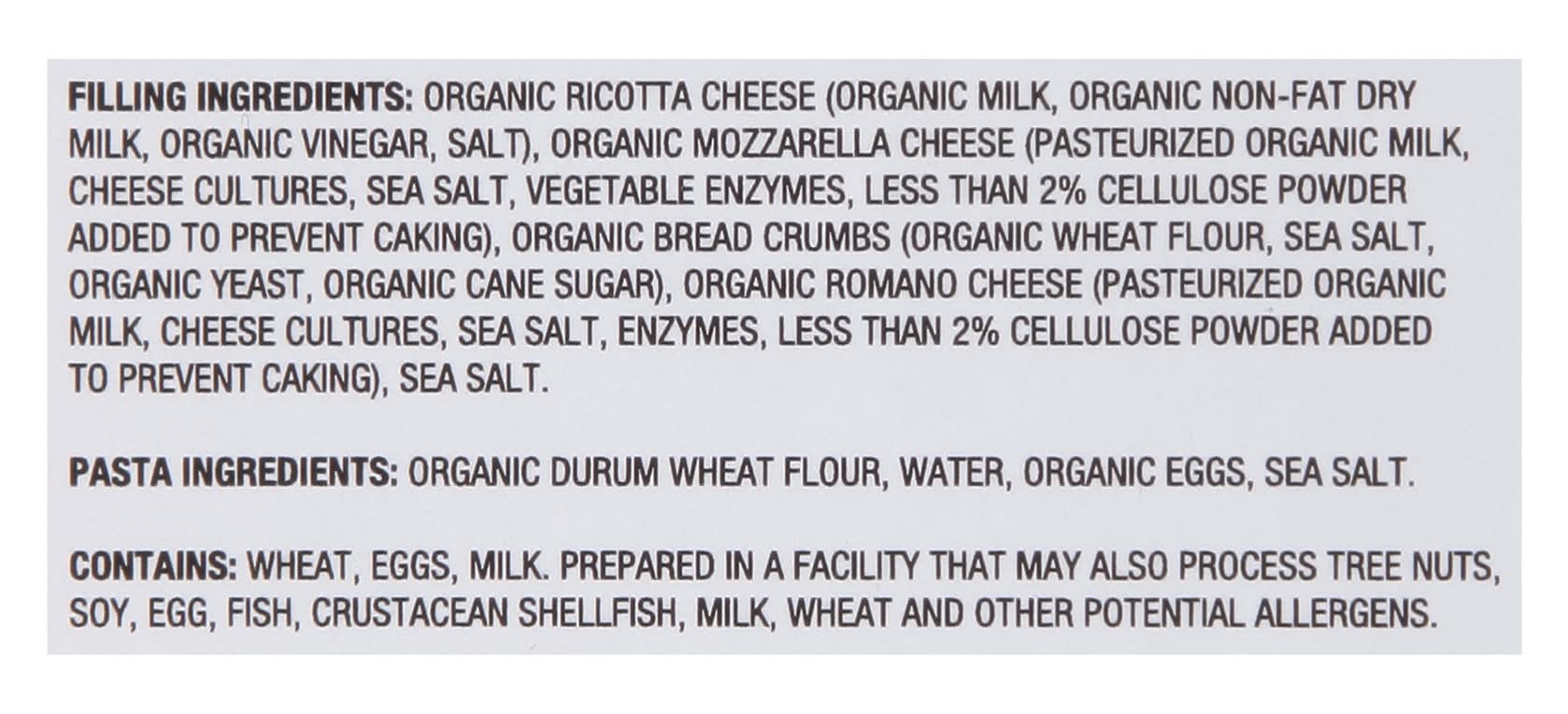 Filling Ingredients: Organic Ricotta Cheese (Organic Milk, Organic Non-Fat Dry Milk, Organic Vinegar, Salt), Organic Mozzarella Cheese (Pasteurized Organic Milk, Cheese Cultures, Sea Salt, Vegetable Enzymes, Less than 2% Cellulose Powder Added to Prevent Caking), Organic Bread Crumbs (Organic Wheat Flour, Sea Salt, Organic Yeast, Organic Cane Sugar), Organic Romano Cheese (Pasteurized Organic Milk, Cheese Cultures, Sea Salt, Enzymes, Less than 2% Cellulose Powder Added to Prevent Caking), Sea Salt. Pasta Ingredients: Organic Durum Wheat Flour, Water, Organic Eggs, Sea Salt Contains: Wheat, Eggs, Milk, Tree Nuts, Soybeans, Eggs, Fish, Crustacean Shellfish, Milk, Wheat