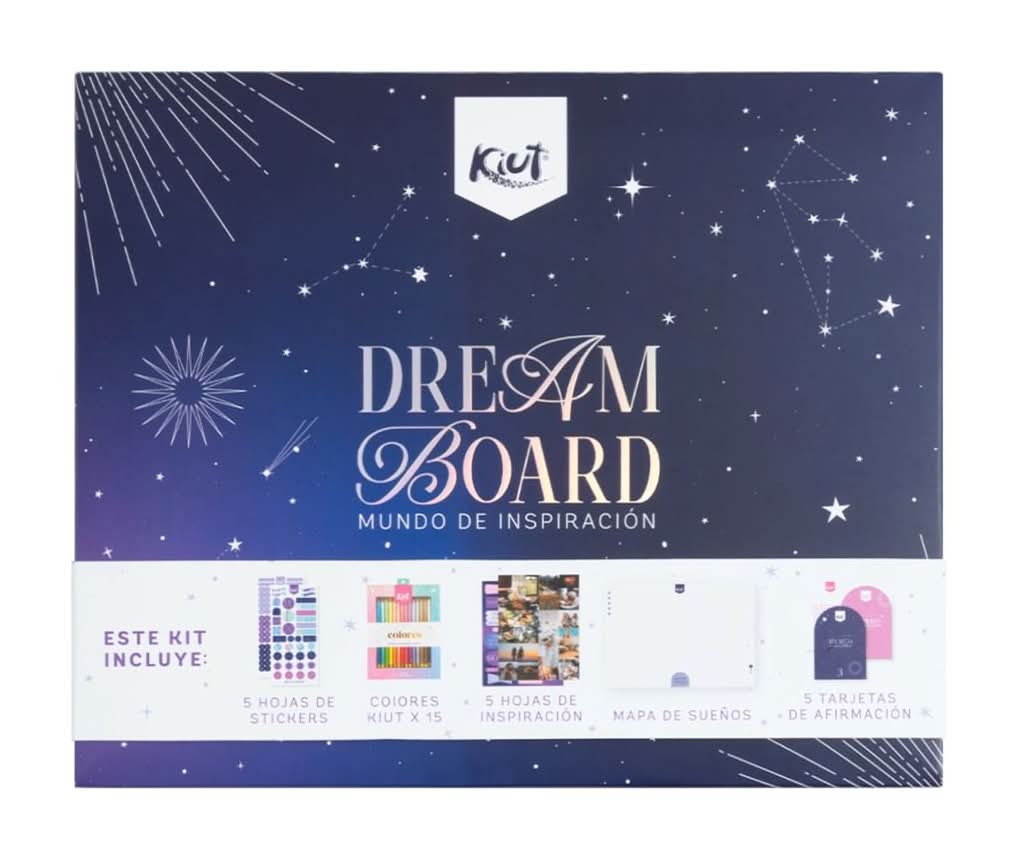 En su interior, el kit Mapa de Sueños e Inspiración incluye: 1 mapa de sueños, 5 tarjetas de afirmación, 1 caja de colores Kiut, 5 hojas de inspiración y 5 hojas de stickers.