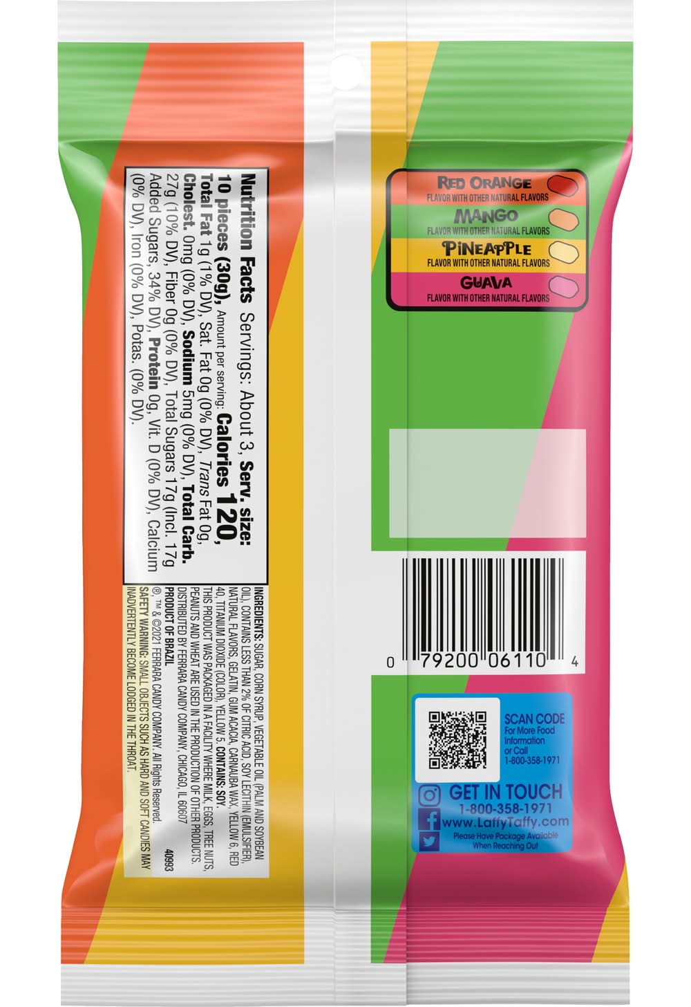 Laffy Taffy Laff Bites Mango Pineapple Tropical Candy offers a burst of fruit flavors in a poppable form. Each serving provides a unique blend of mango and pineapple tastes, enhanced with other natural flavors for a tropical experience. The candy is produced in Brazil and comes with approximately three servings per package. Ferrara Candy Company,
