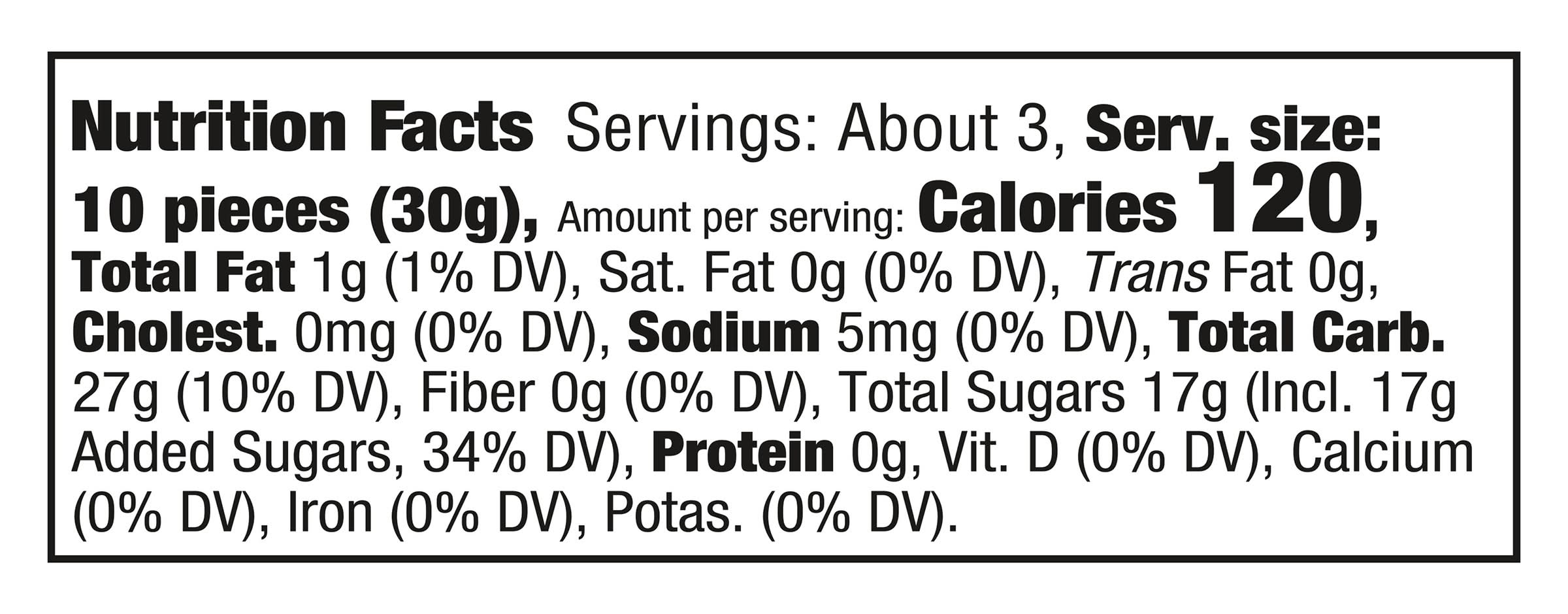 Sugar, Corn Syrup, Vegetable Oil (Palm and Soybean Oil), Contains Less than 2% of Citric Acid, Soy Lecithin (Emulsifier), Natural Flavors, Gelatin, Gum Acacia, Carnauba Wax, Yellow 6, Red 40, Titanium Dioxide (Color), Yellow 5. Contains: Soybeans, Corn, Milk, Eggs, Tree Nuts, Peanuts, Wheat