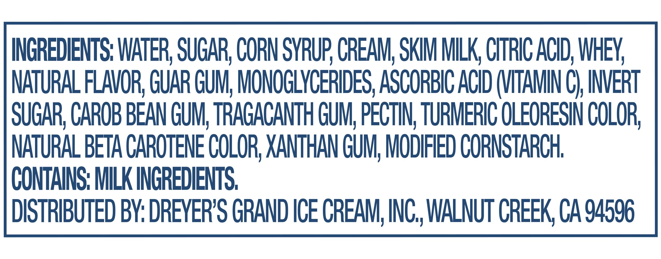 Ingredients: WATER, SUGAR, CORN SYRUP, CREAM, SKIM MILK, CITRIC ACID, WHEY, NATURAL FLAVOR, GUAR GUM, MONOGLYCERIDES, ASCORBIC ACID (VITAMIN C), INVERT SUGAR, CAROB BEAN GUM, TRAGACANTH GUM, PECTIN, TURMERIC OLEORESIN COLOR, NATURAL BETA CAROTENE COLOR, XANTHAN GUM, MODIFIED CORNSTARCH. Contains: MILK INGREDIENTS.