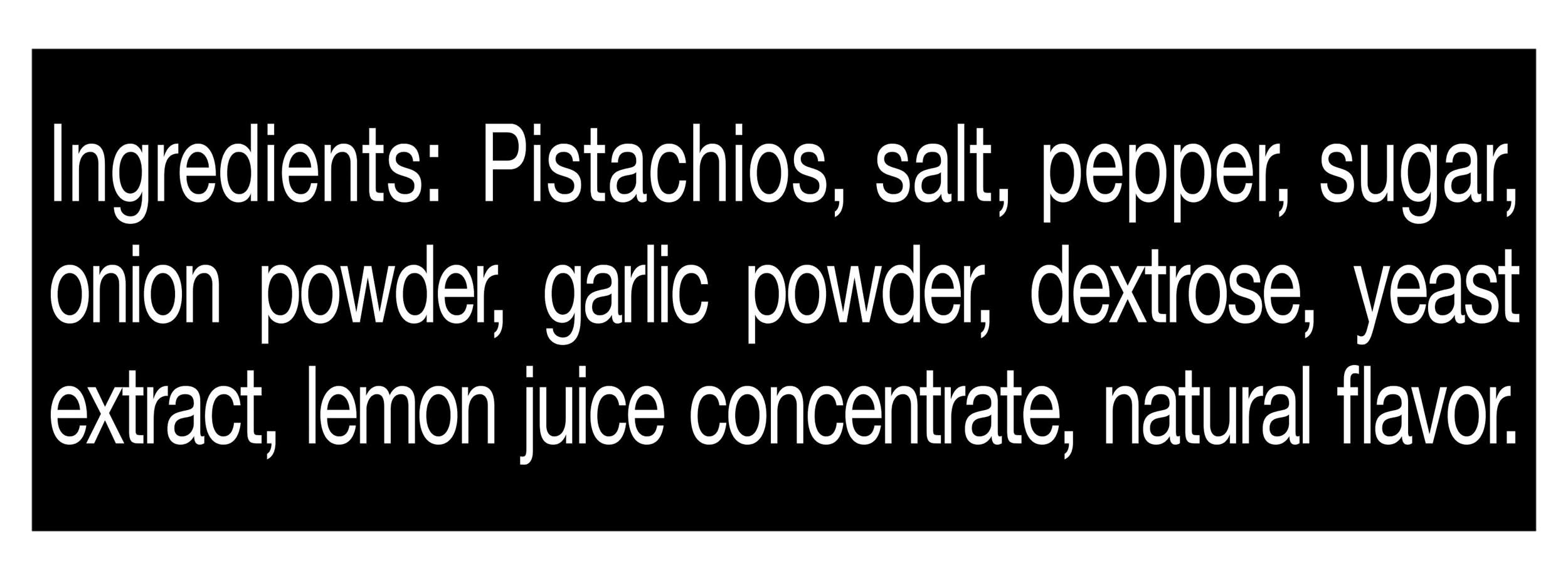 Pistachios, Salt, Pepper, Sugar, Onion Powder, Garlic Powder, Dextrose, Yeast Extract, Lemon Juice Concentrate, Natural Flavor Contains: Tree Nuts, Pistachios