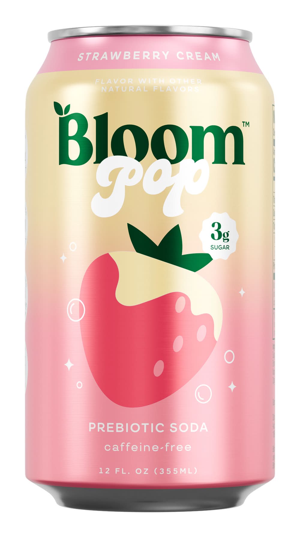 Satisfy your soda cravings with Bloom Pop prebiotic soda Bold, bubbly flavor meets real gut health benefits for a deliciously irresistible sip without the guilt-trip. Crafted with clinically studied prebiotics, better-for-you ingredients, and no junk it's about to become your new soda obsession. • Flavor: Strawberry-cream • Packaging: Reusable