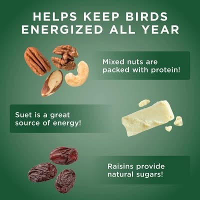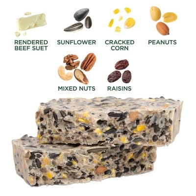 Rendered Beef Suet, Sunflower, Corn, Peanut Meal, Peanuts, Mixed Feed Nuts, Raisins.