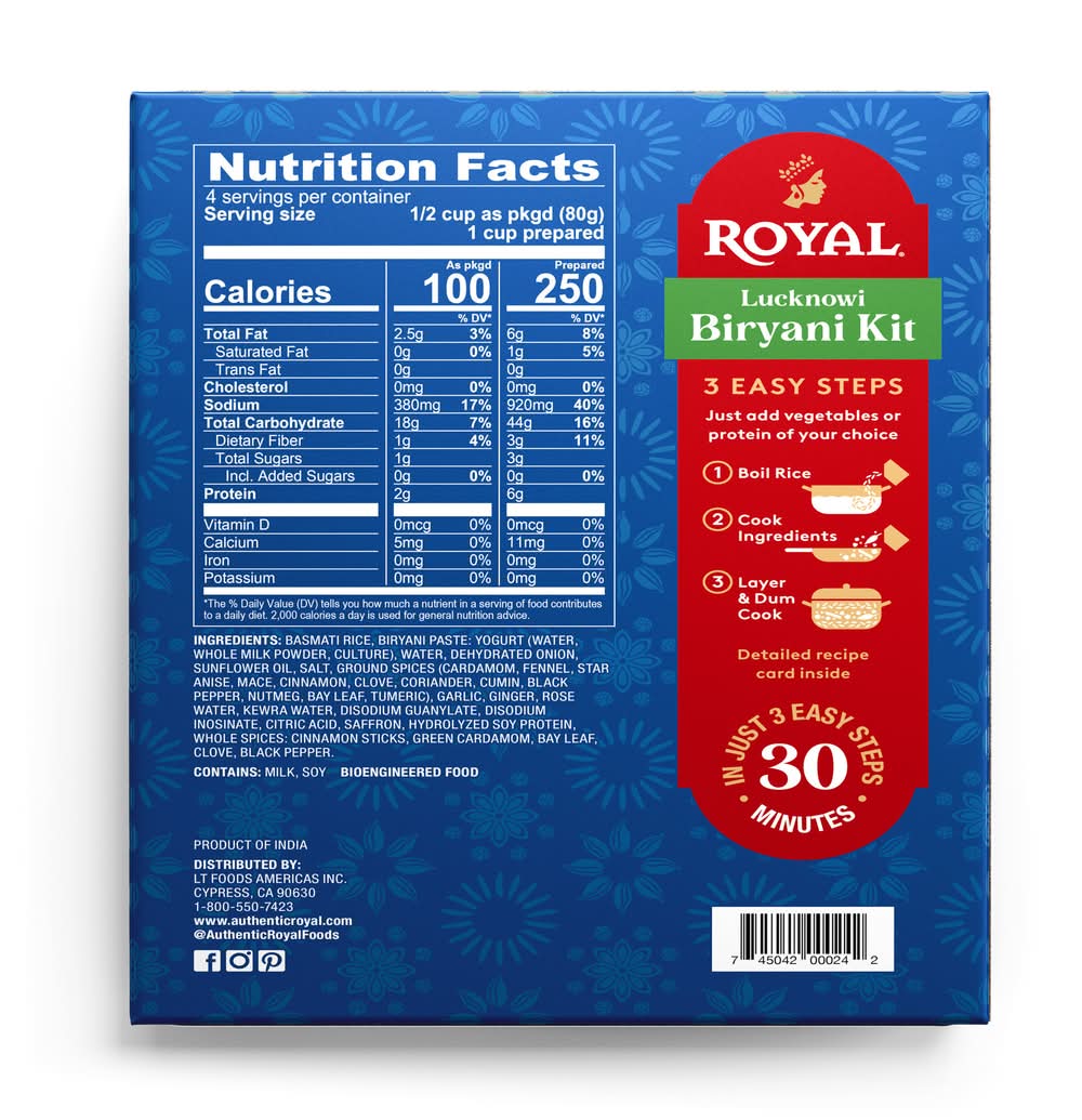 Experience the art of Lucknowi, or Awadhi, cooking techniques, that slow simmer authentic ingredients, aromatic spices, and herbs in a clay pot called a ‘handi’. Lucknowi Biryani, combining Royal® Basmati rice, Lucknowi-style Biryani gravy, and aromatic whole spices. Unleash your creativity and add vegetables or your favorite protein to create your very own restaurant-style Biryani at home.Meal kit includes Flavorful and aromatic long grain white Basmati rice, finest Biryani paste and aromatic whole spices Size: 11.5 oz