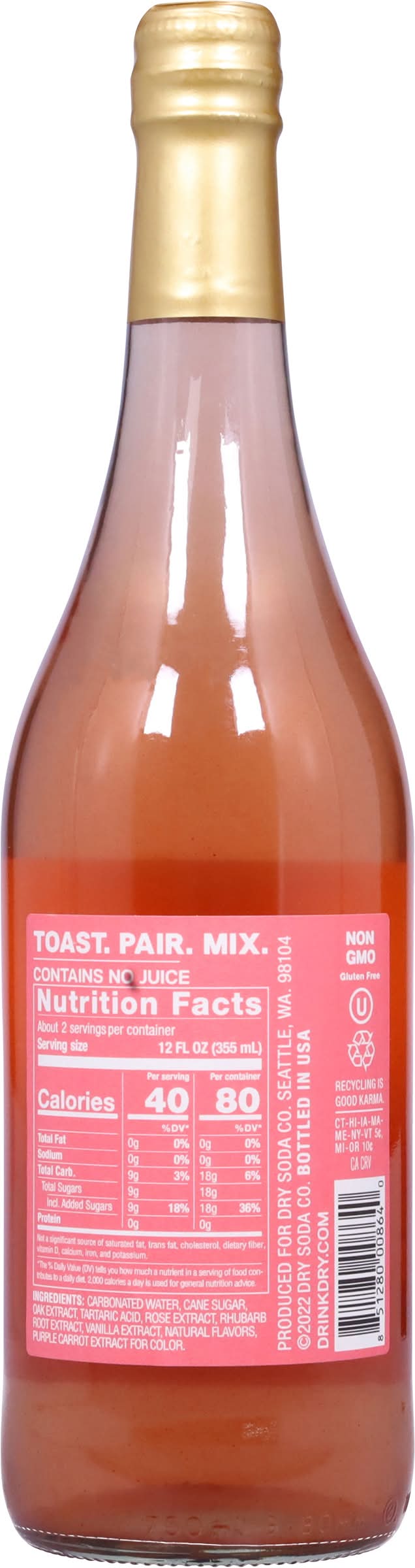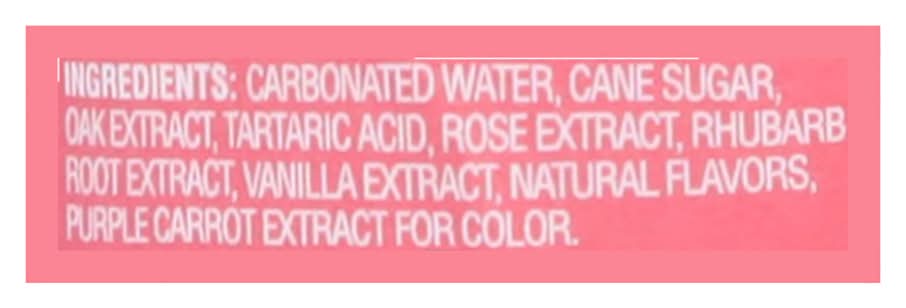 Carbonated Water, Cane Sugar, Oak Extract, Tartaric Acid, Rose Extract, Rhubarb Root Extract, Vanilla Extract, Natural Flavors, Purple Carrot Extract for Color
