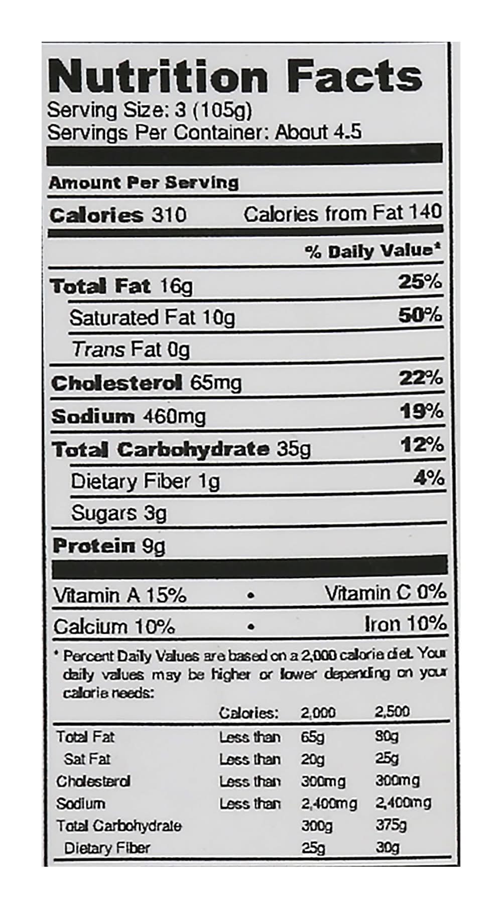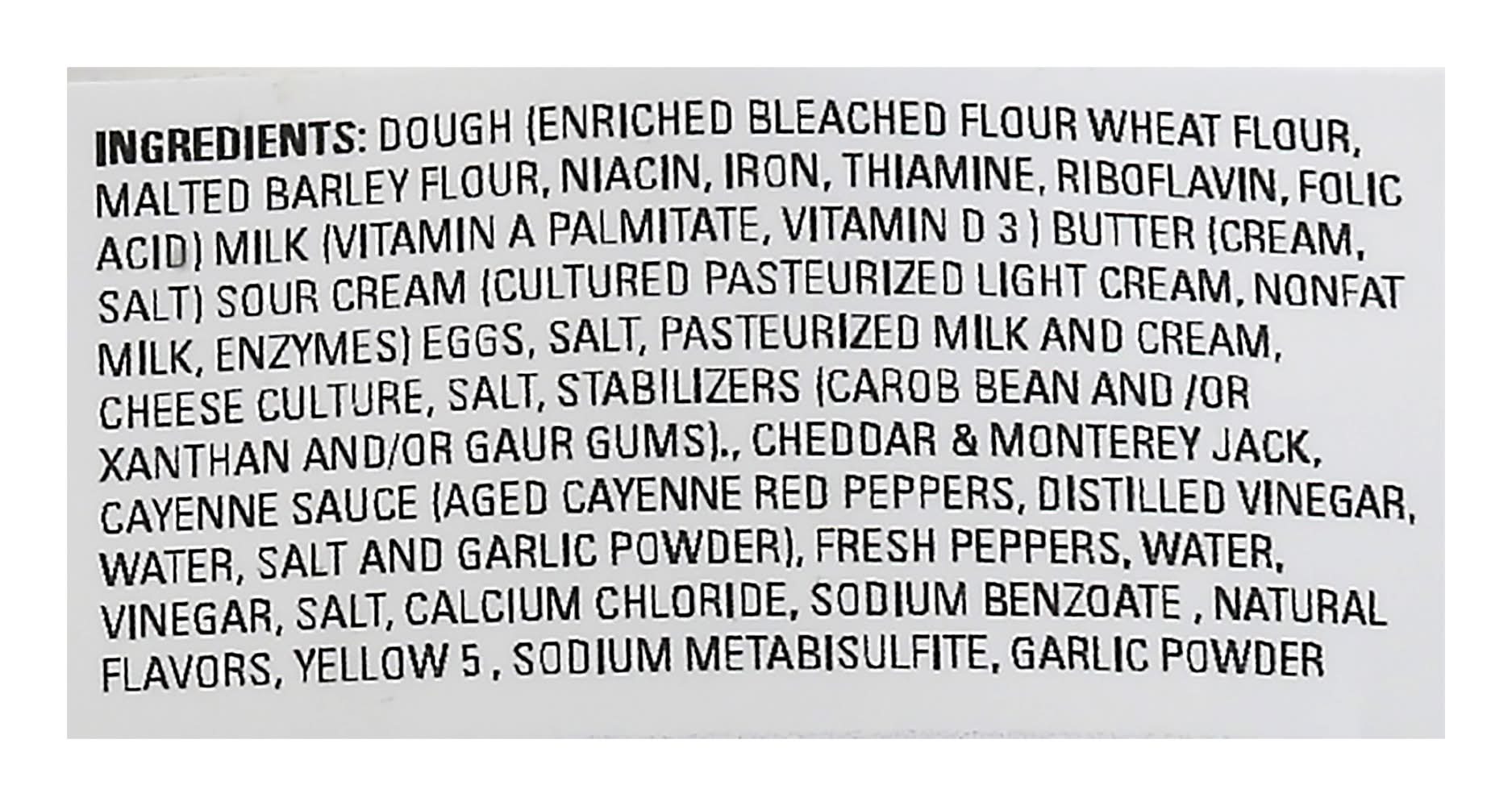 Dough (Enriched Bleached Flour Wheat Flour, Malted Barley Flour, Niacin, Iron, Thiamine, Riboflavin, Folic Acid) Milk (Vitamin A Palmitate, Vitamin D3) Butter (Cream, Salt) Sour Cream (Cultured Pasteurized Light Cream, Nonfat Milk, Enzymes) Eggs, Salt, Pasteurized Milk and Cream, Cheese Culture, Salt, Stabilizers (Carob Bean and/or Xanthan and/or Gaur Gums), Cheddar & Monterey Jack, Cayenne Sauce (Aged Cayenne Red Peppers, Distilled Vinegar, Water, Salt and Garlic Powder), Fresh Peppers, Water, Vinegar, Salt, Calcium Chloride, Sodium Benzoate, Natural Flavors, Yellow 5, Sodium Metabisulfite, Garlic Powder Contains: Milk, Eggs, Wheat