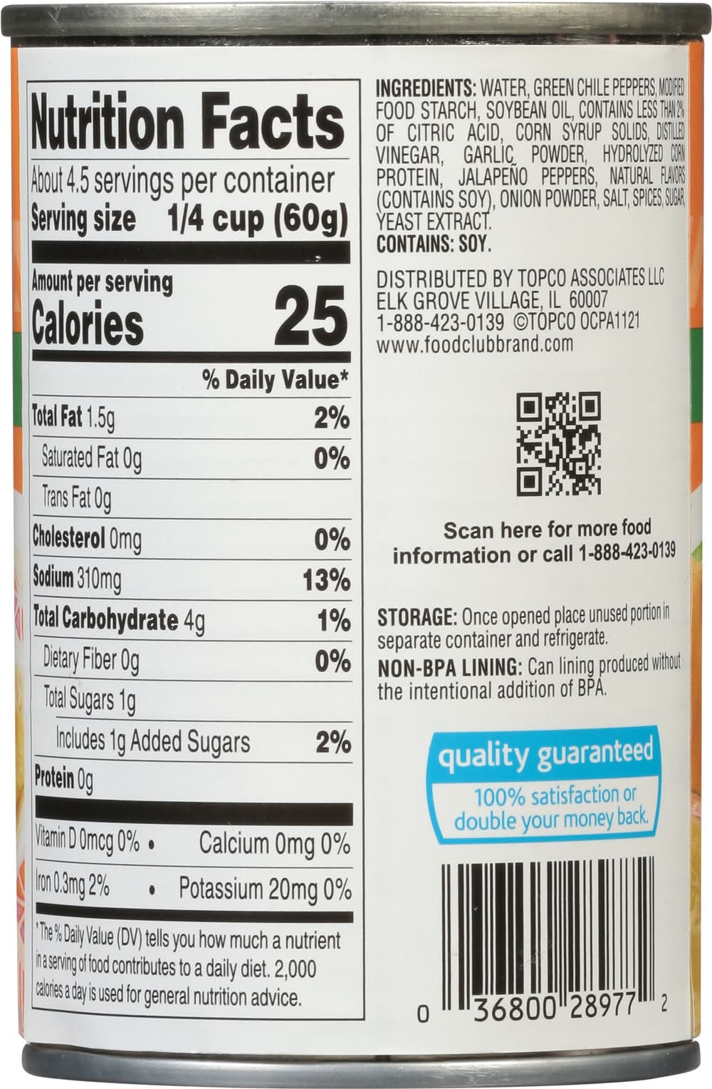 Water, Green Chile Peppers, Modified Food Starch, Soybean Oil, Contains Less than 2% of Citric Acid, Corn Syrup Solids, Distilled Vinegar, Garlic Powder, Hydrolyzed Corn Protein, Jalapeño Peppers, Natural Flavors (Contains Soy), Onion Powder, Salt, Spices, Sugar, Yeast Extract Contains: Soybeans, Corn