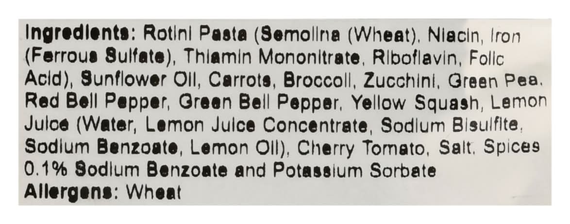 Rotini Pasta (Semolina (Wheat), Niacin, Iron (Ferrous Sulfate), Thiamin Mononitrate, Riboflavin, Folic Acid), Sunflower Oil, Carrots, Broccoli, Zucchini, Green Pea, Red Bell Pepper, Green Bell Pepper, Yellow Squash, Lemon Juice (Water, Lemon Juice Concentrate, Sodium Bisulfite, Sodium Benzoate, Lemon Oil), Cherry Tomato, Salt, Spices 0.1% Sodium Benzoate and Potassium Sorbate Contains: Wheat, Sulfites