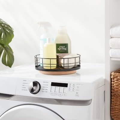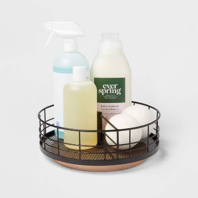 Store everyday items on a countertop while keeping them easily accessible with this Wire Divided Turntable with Natural Wood from Brightroom™. This divided turntable has a round silhouette that makes it ideal for organizing condiments in the refrigerator and household items in the bathroom cabinet. This decorative storage basket has a open black wire design with wooden base that adds a new level of stylish convenience to your home. Simply spot or wipe clean to keep it looking great. Brightroom™: See your space in a new light. Dimensions: Top and Bottom: 11-inch diameter Overall height: 3.75 inches Interior height: 2.5 inches Interior top and bottom: 10.5-inch diameter