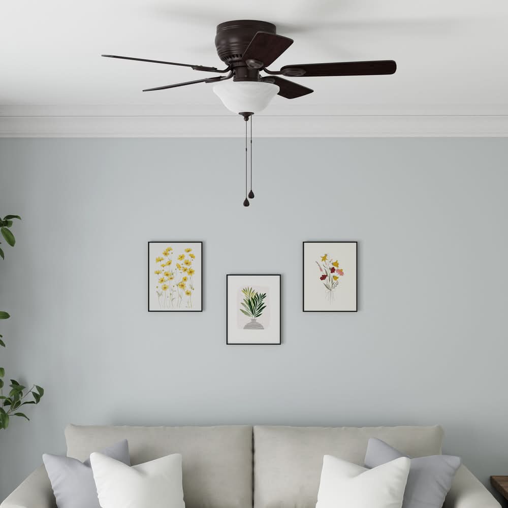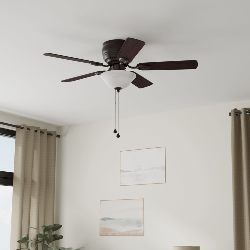 Features a light kit with two 5.5W LED medium base light bulbs.. Only suitable for indoor locations.. At 44-in diameter, this fan is ideal for small rooms up to 100 sq ft.. Includes convenient pull chains to control fan speed and light.. Can only be installed as a flush mount, which is ideal for standard or lower ceilings.. Reversible motor allows for changing the fan direction seasonally to push cool air down in the summer, or distribute warm air evenly in the winter.. Reversible blades to match your style in any room.. This fan provides a CFM of 3087 on high speed.. Replacement shade is available under Lowe's item number 4664707.. Use Location: Indoor For CA Residents Only: WARNING: This product can expose you to chemicals including Lead which are known to the State of California to cause cancer and birth defects or other reproductive harm. For more information go to www.P65Warnings.ca.gov. Color: No