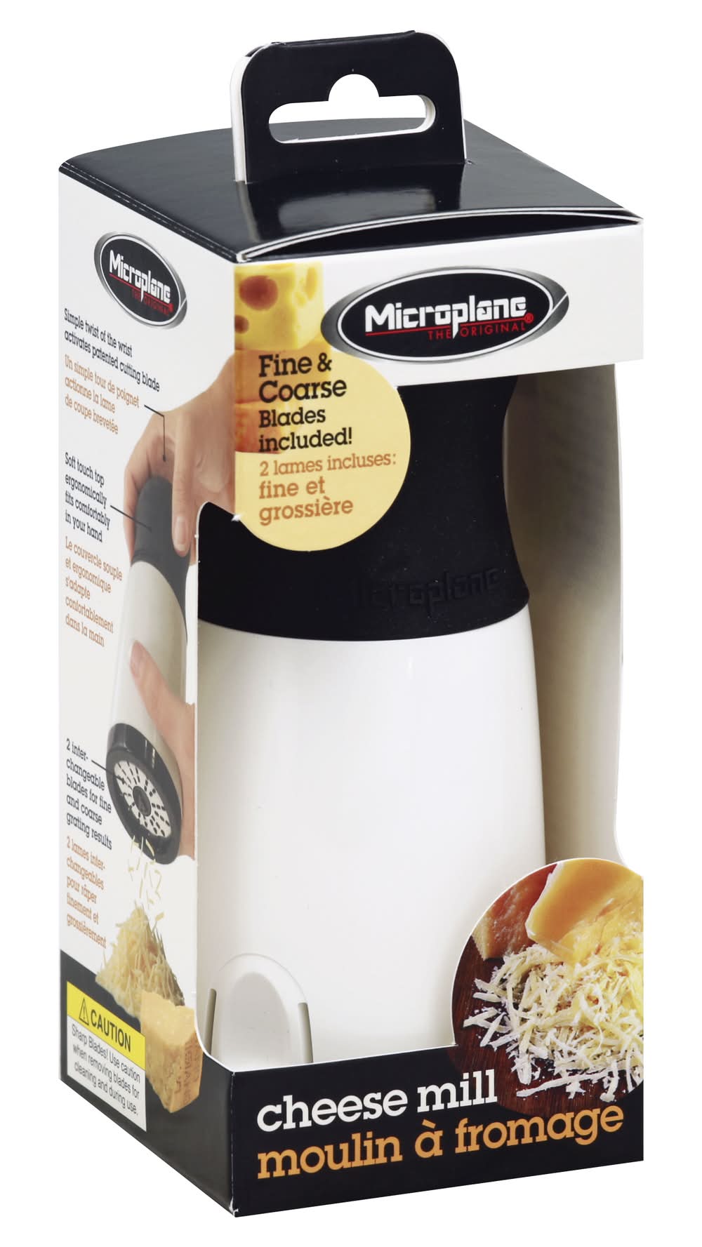 1. Cut cheese into smaller pieces. Remove top of cheese mill and place cheese on either side of the body. 2. Replace top and gently push down. 3. Continuously twist top of mill in a clockwise direction. Simple twist of the wrist activates patented cutting blade. Soft touch top ergonomically fits comfortably in your hand. 2 inter-changeable blades for the and coarse grating results.