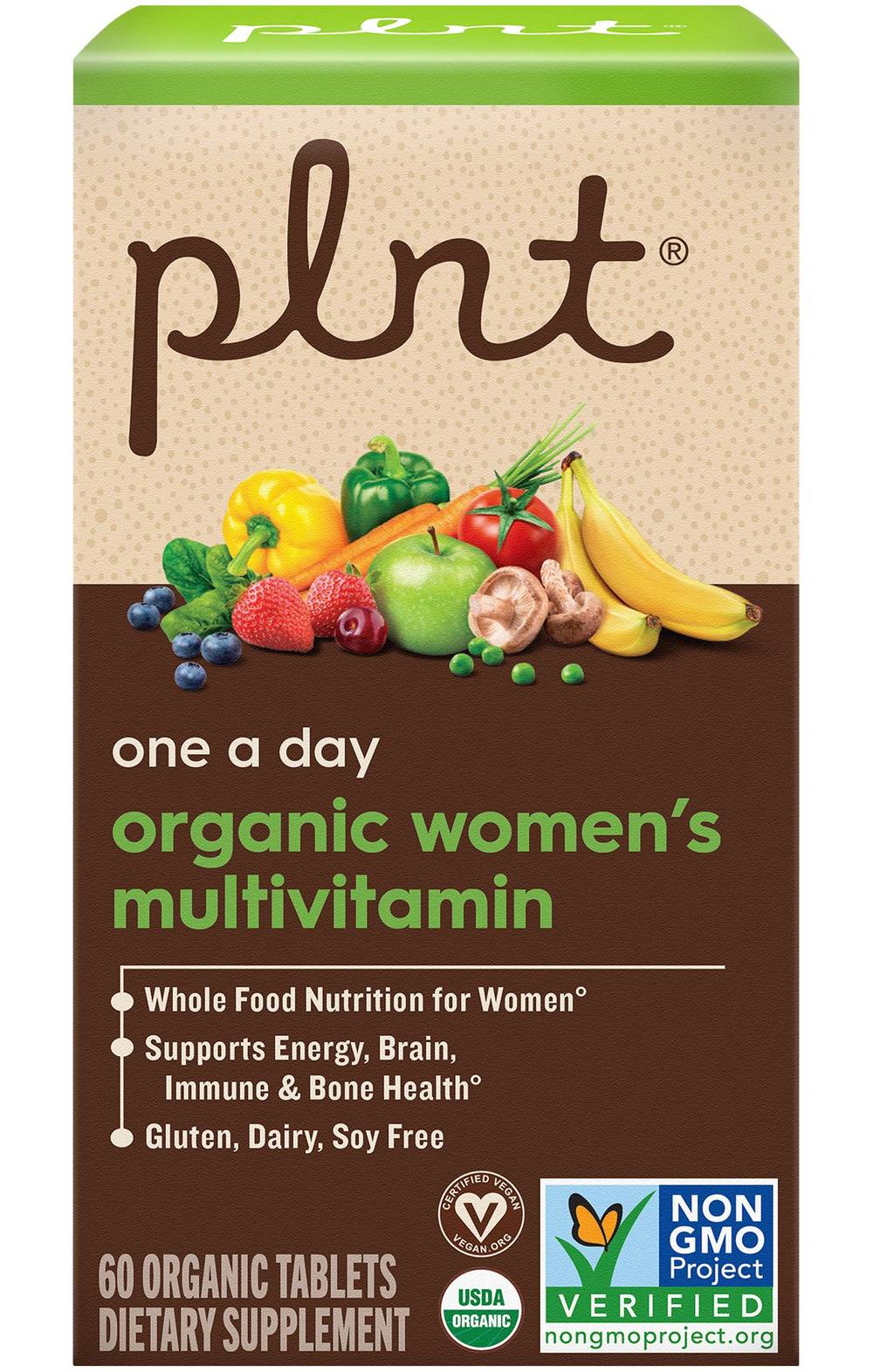 Supports energy, brain, immune, and bone health Once-daily formula Certified Vegan, USDA Organic, and Non-GMO Project Verified Free of gluten, dairy, and soy Organic Women's Multivitamin is a convenient one-a-day tablet that provides whole food nutrition to meet the unique needs of womenincluding support for energy, brain, immune, and bone health. All plnt� products are made from whole food or plant-based ingredients sourced in nature, contain zero synthetic colors, sweeteners, or flavors, and are always tested to ensure purity and potency.