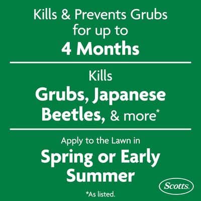 Scotts GrubEx1 Season Long Grub Killer prevents turf damage by killing grubs when they are young. One application of this lawn care treatment kills and prevents grubs for up to 4 months. Also controls caterpillars (armyworm), chinchbugs, May/June beetles, and more (as listed). Apply this granular insecticide to a dry lawn in the spring or early summer to kill grubs as they develop before they cause damage to your lawn. One 28.7 lb bag of Scotts® GrubEx®1 Season Long Grub Killer covers 10,000 sq ft..