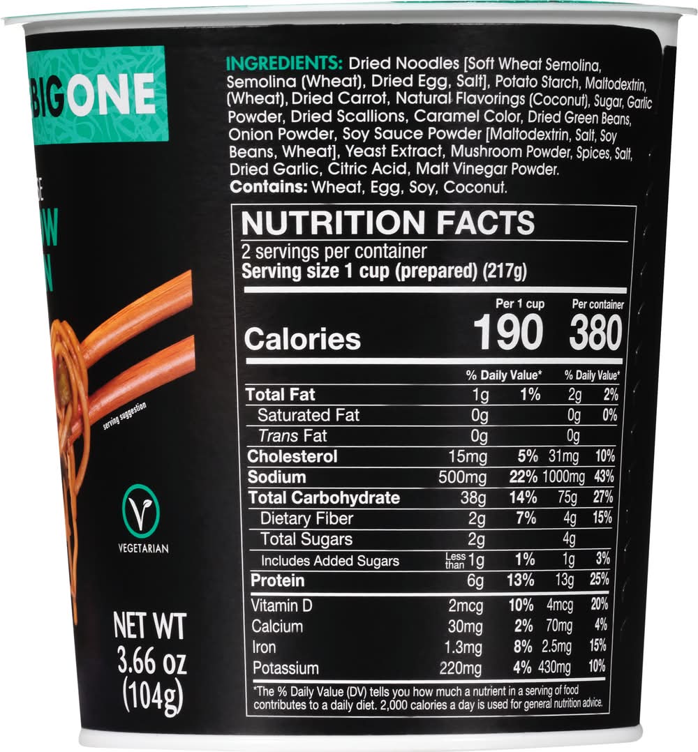 Dried Noodles [Soft Wheat Semolina, Semolina (Wheat), Dried Egg, Salt], Potato Starch, Maltodextrin (Wheat), Dried Carrot, Natural Flavorings (Coconut), Sugar, Garlic Powder, Dried Scallions, Caramel Color, Dried Green Beans, Onion Powder, Soy Sauce Powder [Maltodextrin, Salt, Soy Beans, Wheat], Yeast Extract, Mushroom Powder, Spices, Salt, Dried Garlic, Citric Acid, Malt Vinegar Powder Contains: Wheat, Eggs, Soybeans, Tree Nuts