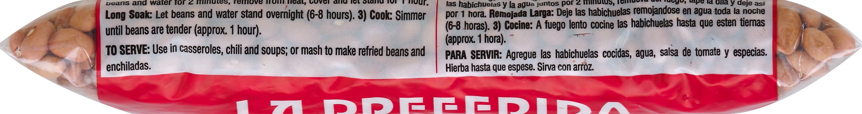 To Prepare: [1 lb dry beans (2 cups) = 5-6 cups cooked beans]. 1) Sort and rinse beans. 2) Soak to reduce cooking time (use 6 cups water for every 1 lb dry beans; oversoaking may cause beans to split). Quick Soak: Boil beans and water for 2 minutes, remove from heat, cover and let stand for 1 hour. Long Soak: Let beans and water stand overnight (6-8 hours). 3) Cook: Simmer until beans are tender (approx. 1 hour). To Serve: Use in casseroles, chili and soups; or mash to make refried beans and enchiladas.