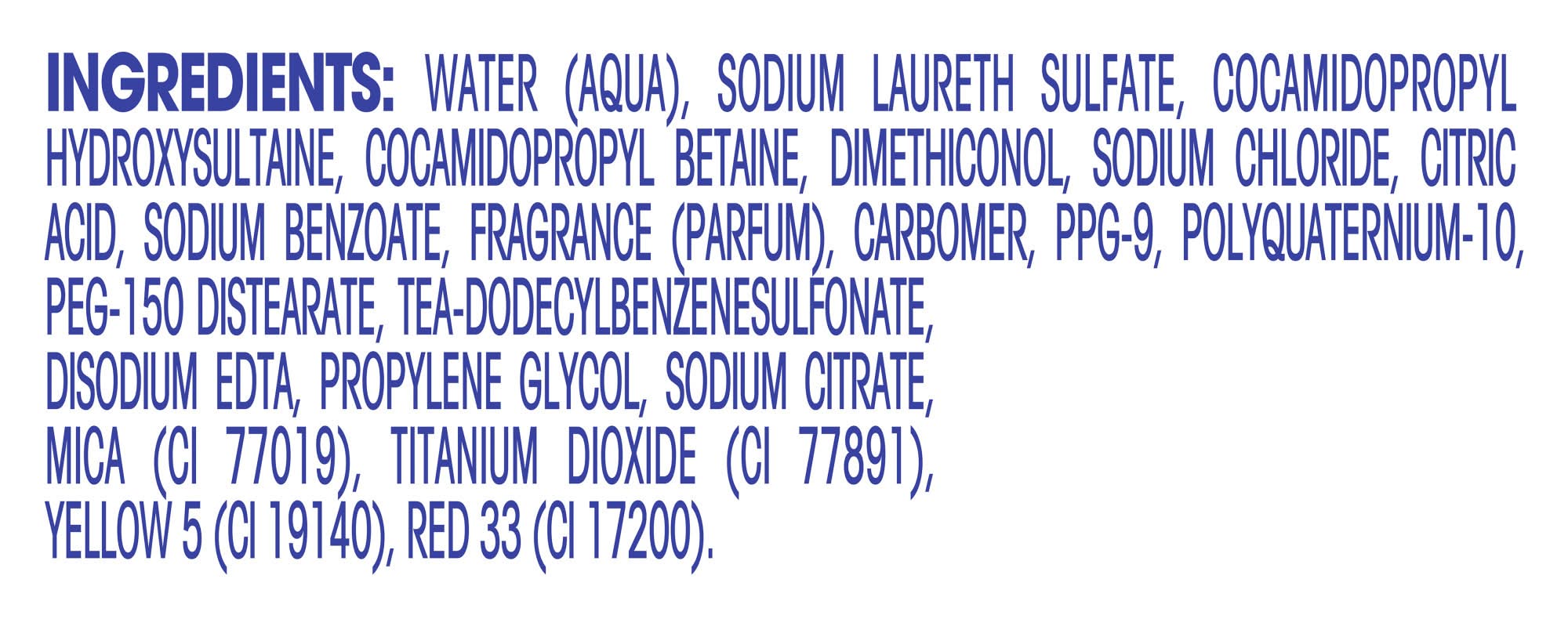 WATER (AQUA), SODIUM LAURETH SULFATE, COCAMIDOPROPYL HYDROXYSULTAINE, COCAMIDOPROPYL BETAINE, DIMETHICONOL, SODIUM CHLORIDE, CITRIC ACID, SODIUM BENZOATE, FRAGRANCE (PARFUM), CARBOMER, PPG-9, POLYQUATERNIUM-10, PEG-150 DISTEARATE, TEA-DODECYLBENZENESULFONATE, DISODIUM EDTA, PROPYLENE GLYCOL, SODIUM CITRATE, MICA (CI 77019), TITANIUM DIOXIDE (CI 77891), YELLOW 5 (Cl 19140), RED33 (CI 17200)