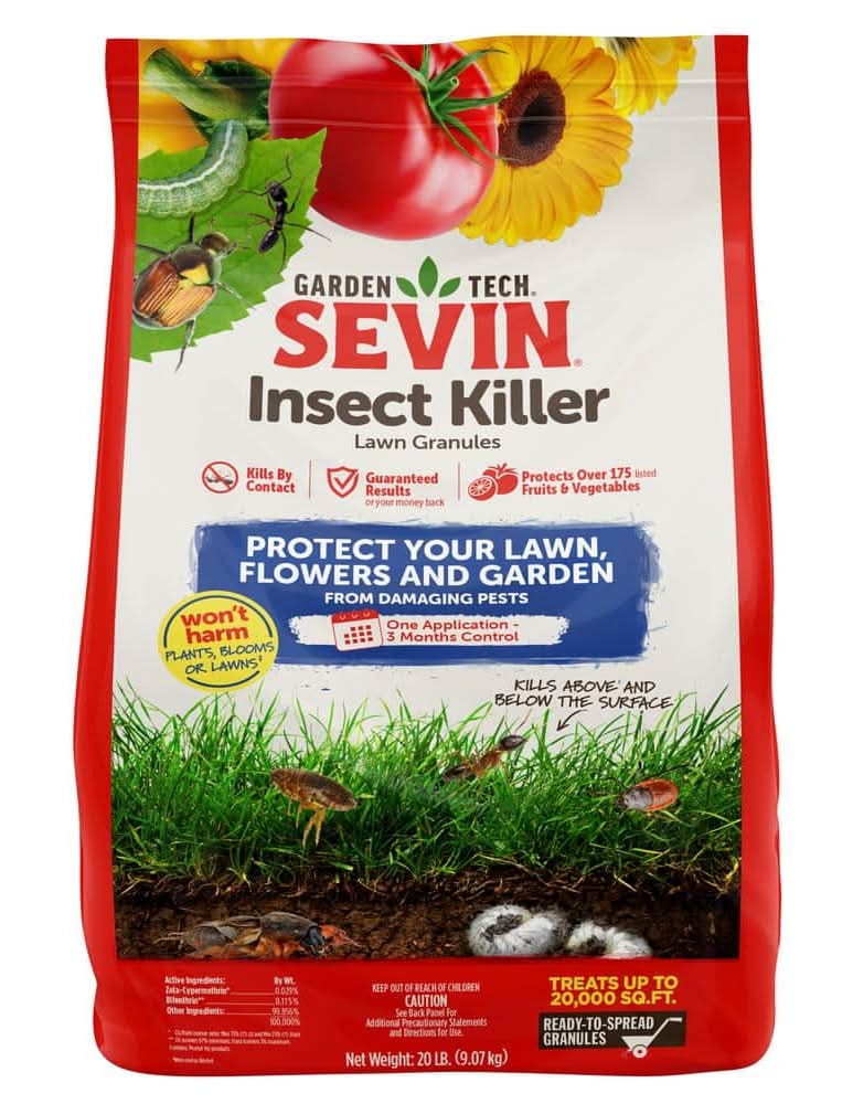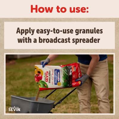 Protect your lawn and edibles from damaging pests with Sevin Insect Killer Lawn Granules. This formula will not harm your plants, blooms or lawns - instead, it will kill pests above and below the surface. Ready to spread, apply the granules evenly to your lawn using a broadcast spreader. Follow the specified application rate for your specific area, which are listed on the bag. Use these granules as a preventative application or to control existing pests in your yard. Sevin Insect Killer Lawn Granules kills more than 100 insect pests by contact and keeps protecting for up to 3 months. Use this to kill and control unwanted insects in lawns, fruit and vegetable gardens, ornamental plants and shrubs, flowers and ground covers, and structures. This can also be used as an outdoor barrier treatment, providing more protection. Sevin Granules protects tomatoes, peppers, zucchini, sugar snap peas, carrots, blueberries, grapes, raspberries, broccoli, kale, spinach, cucumber, pumpkin, watermelon, and many more listed fruits and vegetables from pests like ants, aphids, armyworms, fleas, ticks, beetles, cutworms, Japanese beetles, chinch bugs, caterpillars, and many more. Do not spray open blooms to protect pollinating insects. Once applied to lawn, water immediately. These granules are highly effective and fast acting - don't forget to check the label to find the specific application rates for the list of pests.