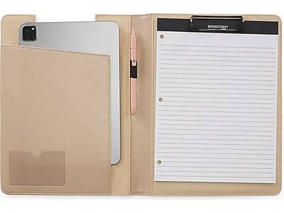 Attractive and convenient, this Bond Street vegan leather padfolio features a rigid back, an easily removable writing pad, and a place to store paper documents. - Attractive and convenient, this padfolio is a perfect companion for any professional - Made of vegan leather in a taupe finish - Features a sleeve for your tablet or loose papers, an ID window, and a business cards slot - Writing pad included - Dimensions: 12.5H x 9.75W x 0.4D - Practical pen holder and clipboard fastener for added convenience - ⚠ WARNING: California Proposition 65 Warning. This product can expose you to chemicals including lead, which are known to the State of California to cause cancer and birth defects or other reproductive harm. For more information go to www.P65Warnings.ca.gov