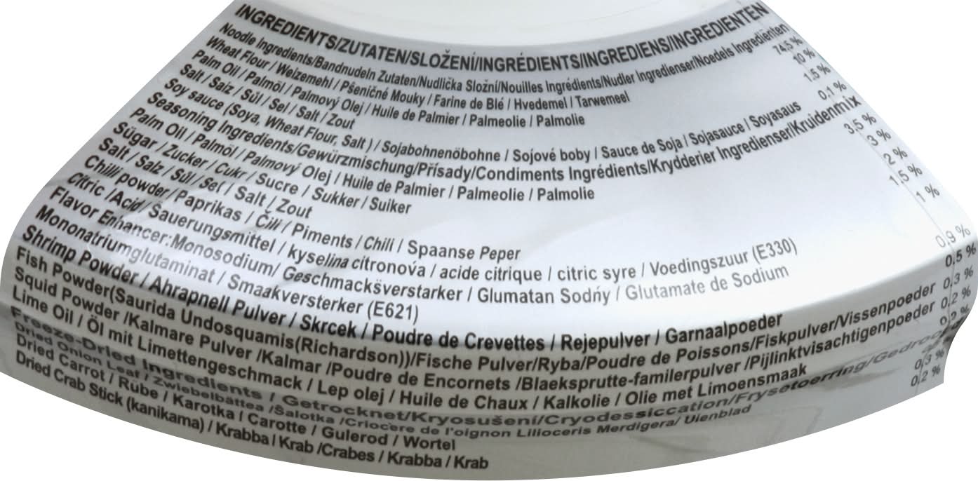 Noodle Ingredients: Wheat Flour, Palm Oil, Salt, Soy Sauce. Seasoning Ingredients: Palm Oil, Sugar, Salt, Pepper Powder, Chili Powder, Citric Acid. Flavor Enhancer: Monosodium, Mononatriumglutamat, Shrimp Powder, Fish Powder (Saurida Undosquamis [Richardson]), Squid Powder, Line Oil. Freeze-Dried Ingredients: Dried Carrot, Dried Crab Stick Contains: Gluten, Soybeans, Fish, Wheat, Milk, Eggs