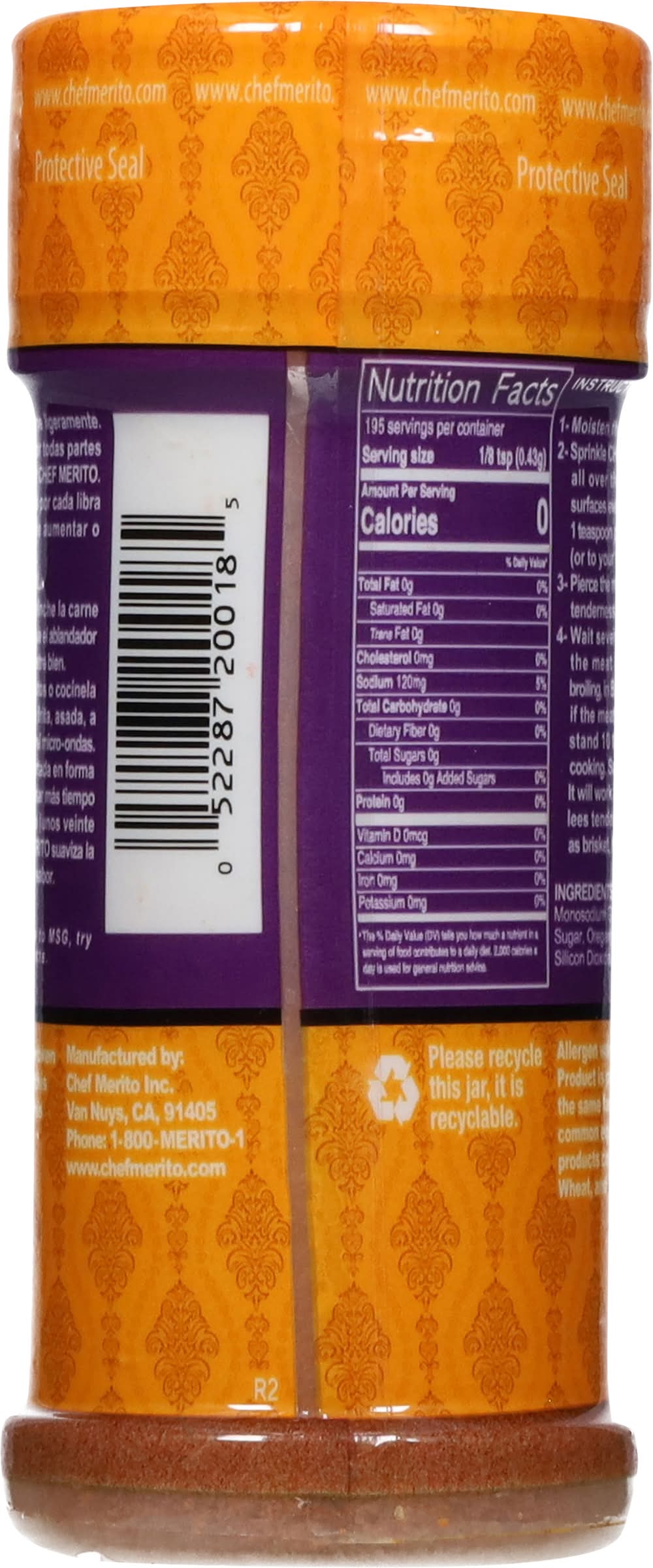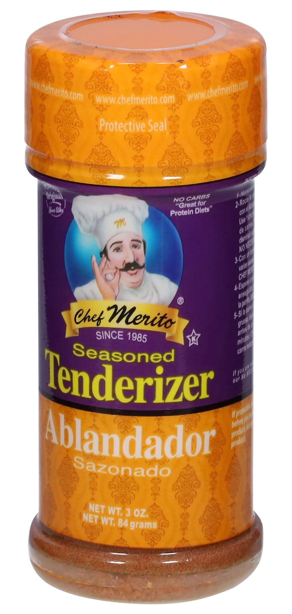 Instructions: 1-Moisten the meat with water. 2-Sprinkle Chef Merito tenderizer all over the meat covering all surfaces evenly. Use approximately 1 teaspoon per pound of meat (or to your taste). 3-Pierce the meat with a fork to insure tenderness. 4-Wait several minutes and cook the meat by frying, roasting, broiling, in B.B.Q. or in the microwave. If the meat is thick, let the meat stand 10 to 20 minutes before cooking. Save with Chef Merito! It will work miracles when used on lees tender kinds of meats such as brisket, flanks, chuck or rounds.
