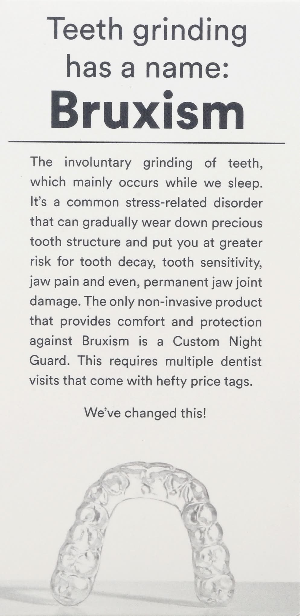 How it Works: Step One: Follow the enclosed instructions to take your upper and lower teeth impressions. Step Two: Use the prepaid postage envelope to send us your teeth impressions. Step Three: We will use the same premium materials and methods as dentists to fabricate your Otis Custom Night Guard and deliver the finished product direct to your door. For best results: Practice healthy hygiene habits and visit your dentist regularly. Your smile will thank you.