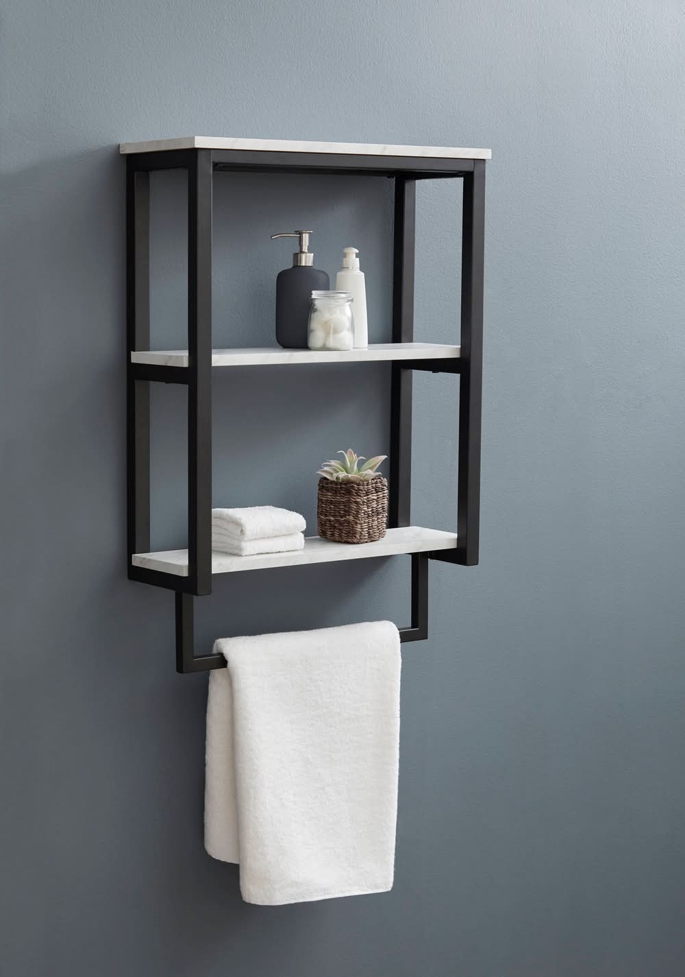 Easy to assemble with installation guide and assembly hardware included. Adds style and functionality to your space Adds style and functionality to your space with a marble-inspired design. Towel bar included. Square tube frame design.