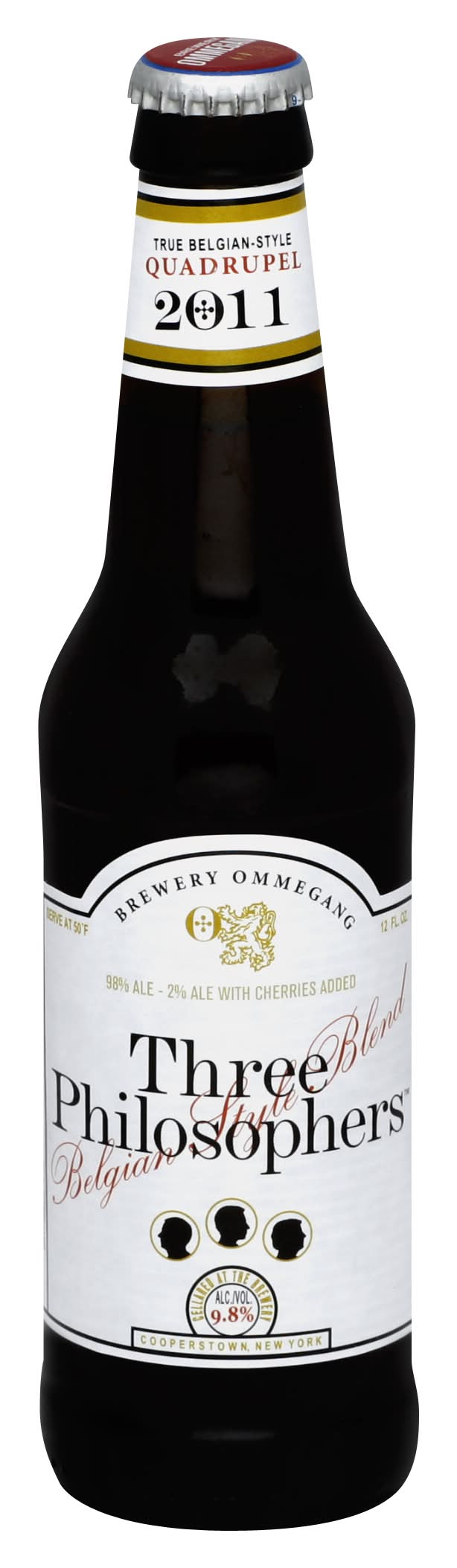 Ommegang Three Philosophers offers a Belgian-Style Quadruple Ale with a complex profile. It features toffee and caramel malts complemented by a subtle hint of cherry. The ale concludes with a dry, carbonated finish. Alcohol by volume: 9%