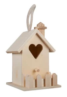 Find the 4.5" Wood Heart Birdhouse with Fence by Make Market at Michaels. Featuring a darling design with a heart-shaped opening and picket fence around the front, decorate this piece with colorful paints, stain and other embellishments for a cute decor accent to display on your covered patio or breakfast nook. Unfinished . 3.5" x 3.3" x 4.7" (8.8cm x 8.3cm x 11.9cm) . Poplar plywood, paulownia wood and cotton . Rope attached for hanging