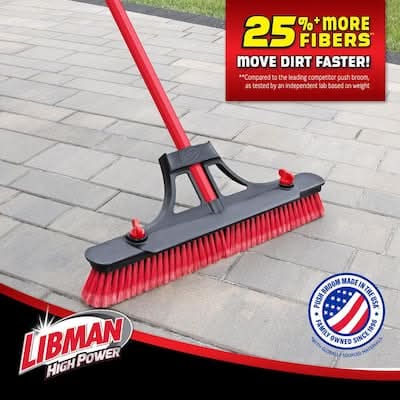 Boasting a fiberglass handle and robust, thick resin brace, this new push broom from Libman is built to last a lifetime. The Contractor Grade Heavy-Duty Push Broom has stiffer fibers on the inside, and fine fibers on the outside to pick up small dust or larger debris. This 24 in. W sweep works great on any surface. Great tool for heavy-duty use, or for someone looking to buy 1 Libman broom that will last a very long-time. Handle comes equipped with a grip and hanger hole for easy storage in your garage, shed, or workshop - no need for a fancy broom holder. Size: 24 in