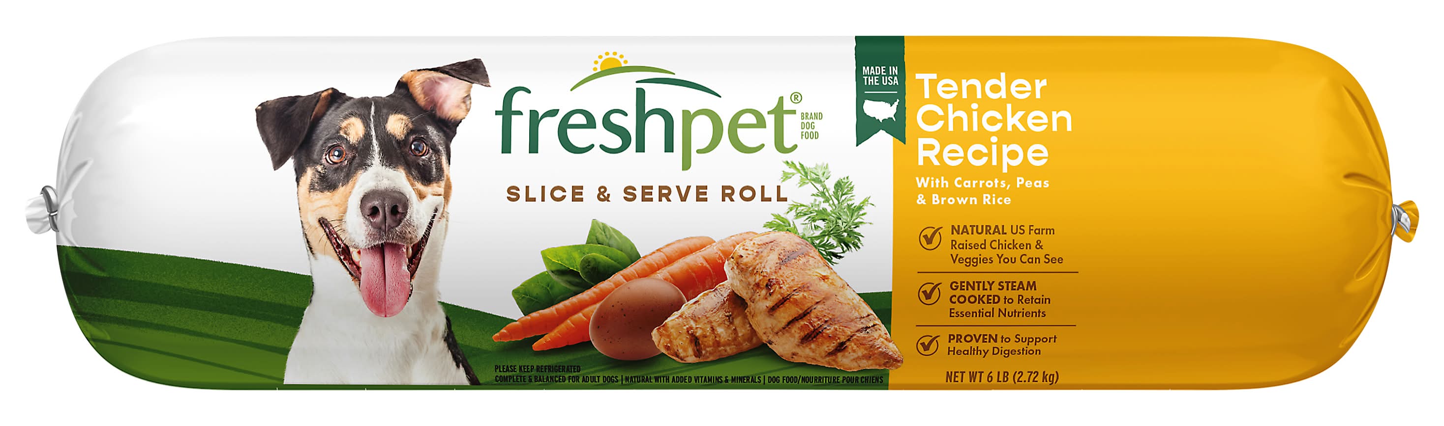 The with carrots, peas and brown rice. fresh. real food from the fridge. no meat meals or never any when switching foods, gradually increase the new food and decrease the previous food to help make a smooth transition. visit your veterinarian regularly to maintain your pet's health. always provide fresh water. we believe our dogs and cats deserve real food that makes a difference in their happy tail-wagging lives. we're committed to delivering on this belief in ways that are good for pets, good for people and good for the planet. if for any reason our foods do not look or smell fresh. Freshpet, PO Box 2157, Secaucus, Nj