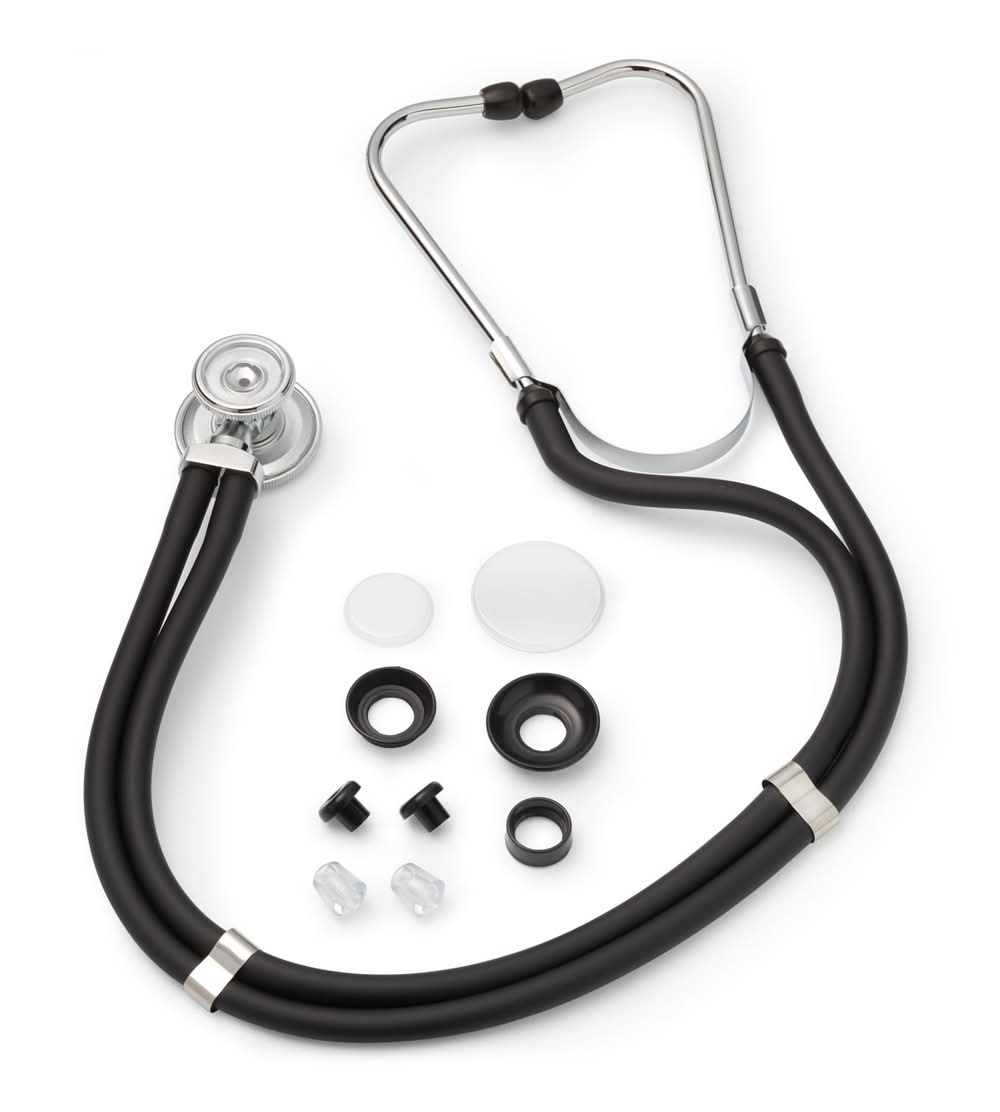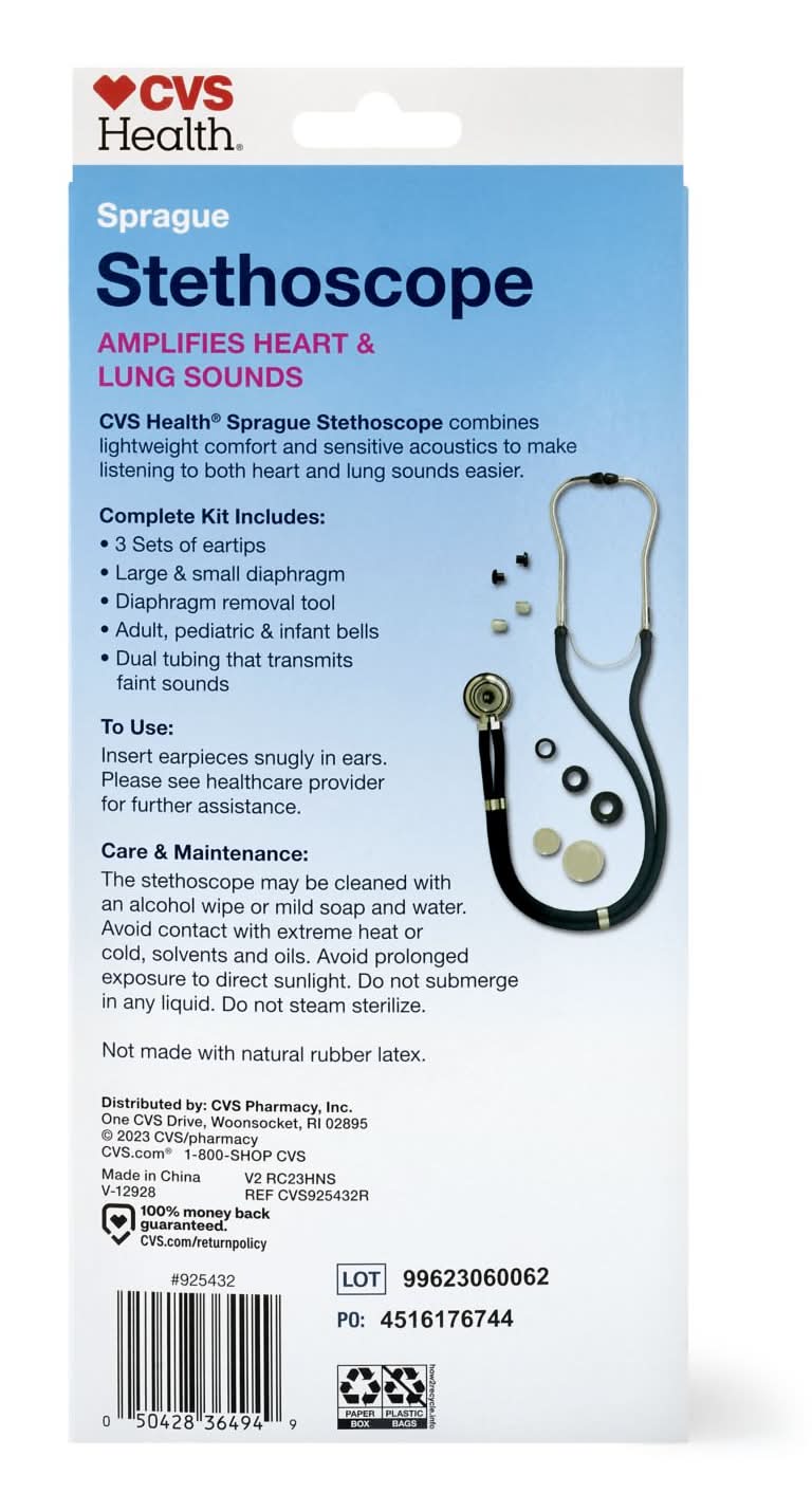 Latex-free. Amplifies heart & lung sounds. Complete Kit Includes: 2 sets of eartips; Large & small diaphragm; Adult, pediatric & infant bells; Dual tubing that transmits faint sounds. CVS/pharmacy Sprague Stethoscope combines lightweight comfort and sensitive acoustics to make listening to both heart and lung sounds easier. www.cvs.com. CVS quality. Made in China.