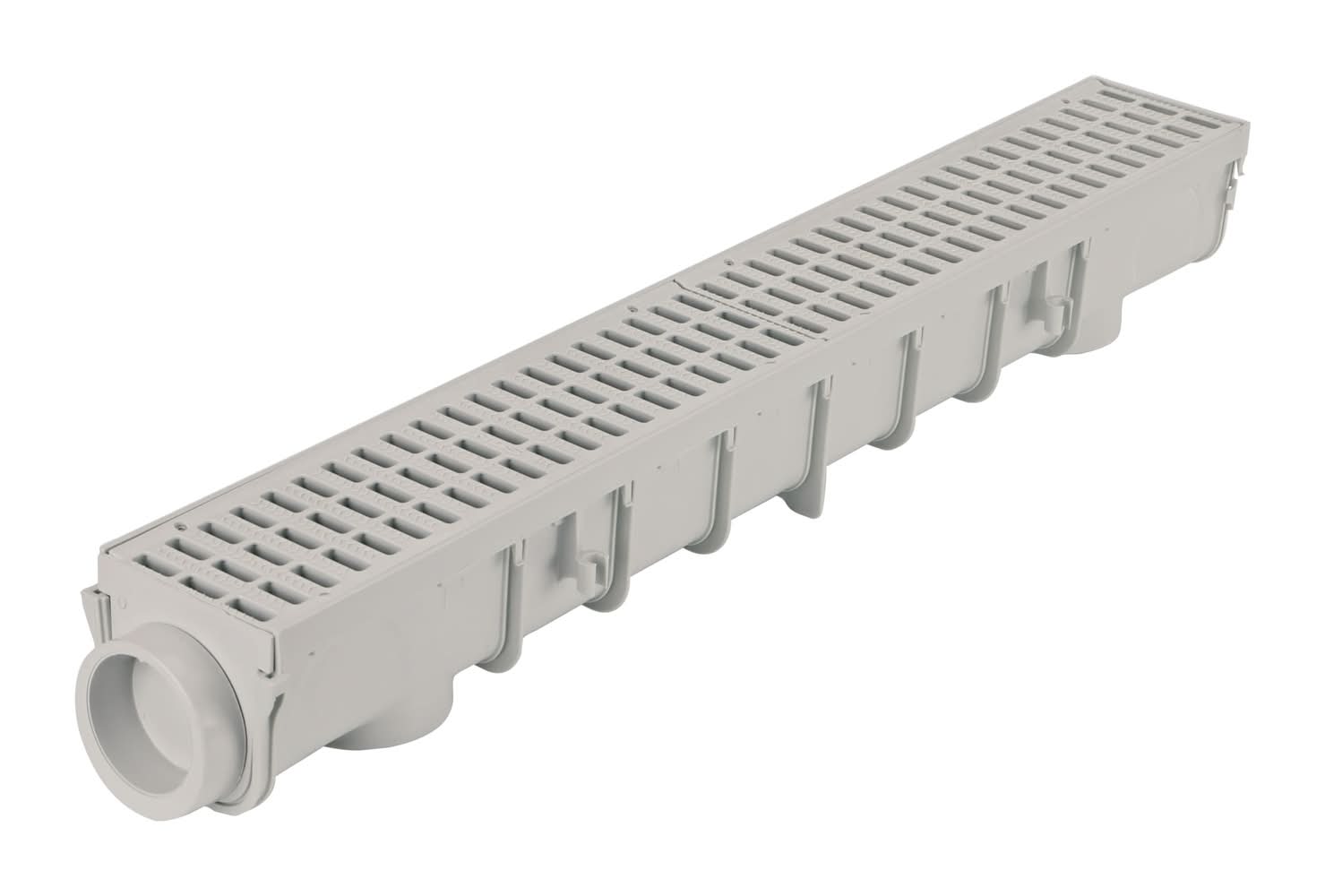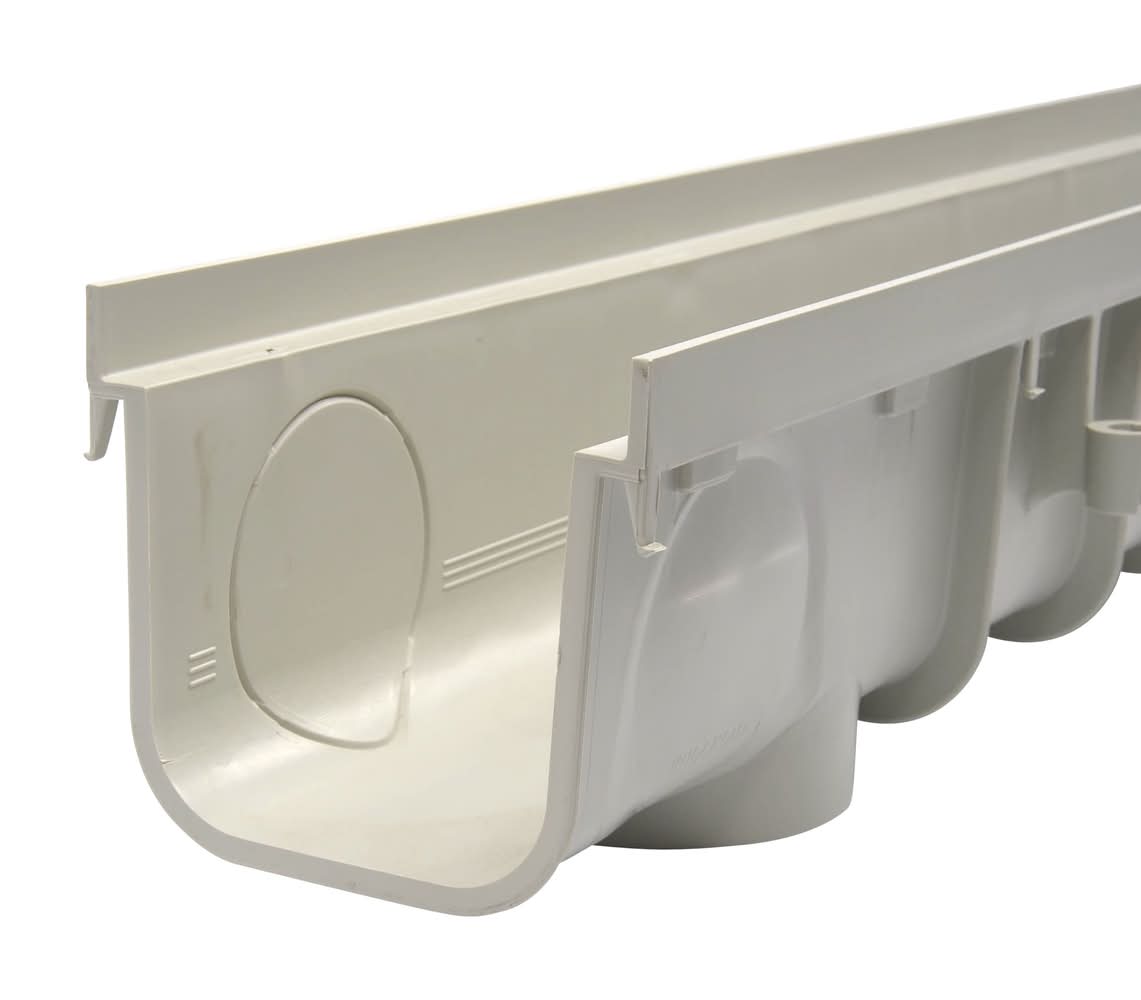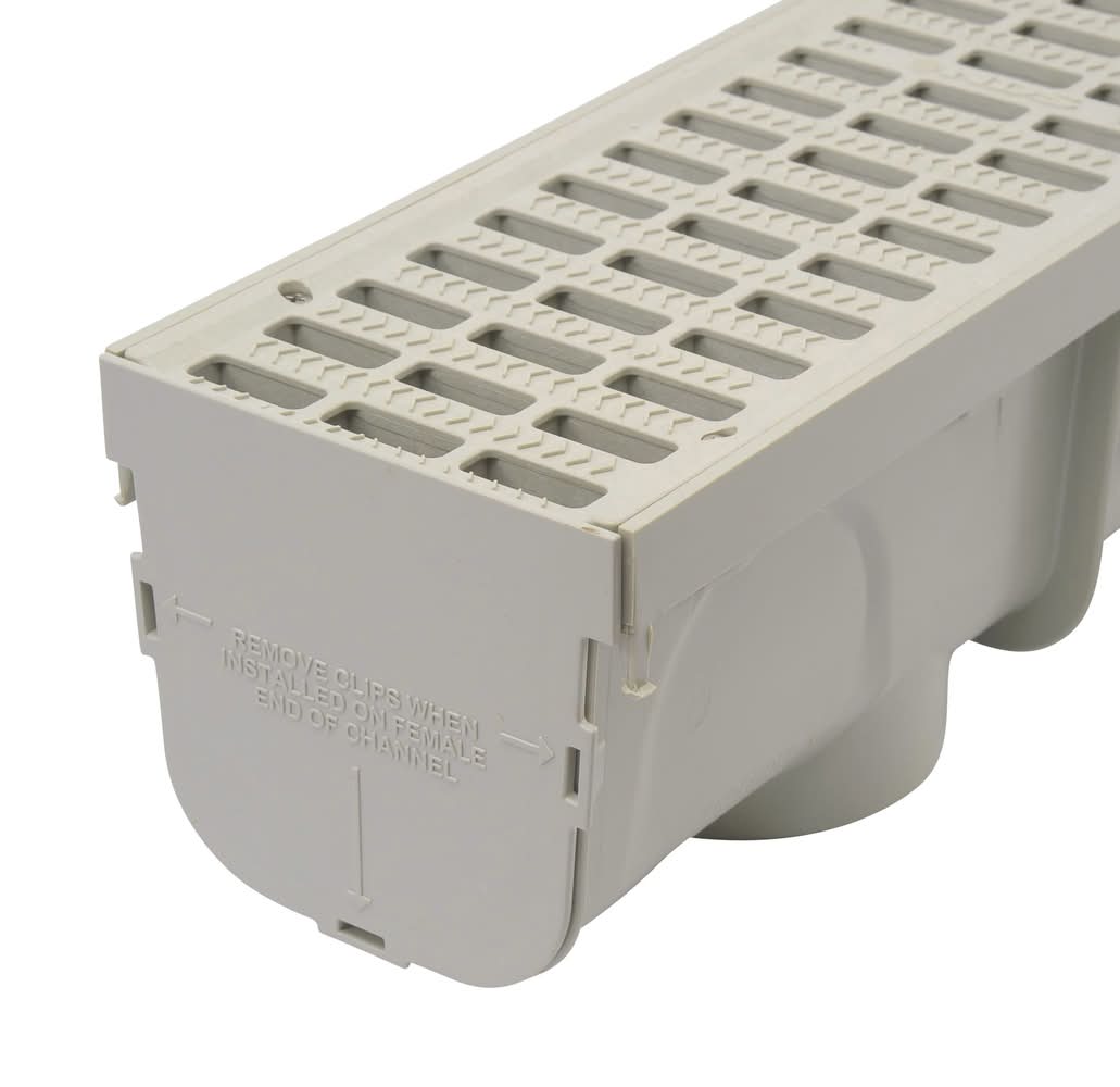 Drain moderate flows from driveways, patios, walkways, courtyards. Built-in interlocking channel design—no couplings needed. Kit includes channel, plastic grates, end cap/outlet, end cap. Prevent mildew growth, concrete staining, and costly structural damage by capturing and conveying excess surface water to drain pipe for release downstream. The 5 inch Pro Series Channel™ Drain Kit with Deep Profile Channel is ideal for draining moderate flows from hardscape surfaces such as driveways, concrete and paver patios, courtyards, walkways, and sports facilities. The 5 inch Pro Series Channel Drain, as part of a complete channel drainage system, collects and conveys water to drain pipes for proper release downstream. Modular design connects together for longer runs, can be cut to size as short as 4 inch long for smaller sections. The 5 inch Pro Series Channel Drain is 4-3/4 inch deep and features a modular design with interlocking joints for a secure channel-to-channel connection—no co For CA Residents Only: WARNING: This product can expose you to chemicals including Lead which are known to the State of California to cause cancer and birth defects or other reproductive harm. For more information go to www.P65Warnings.ca.gov.