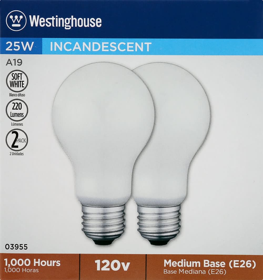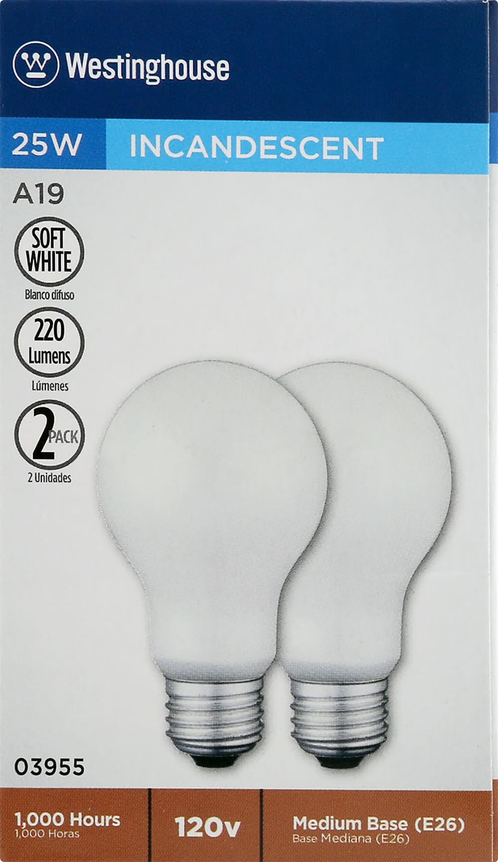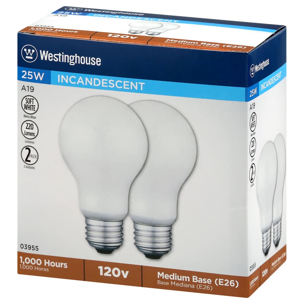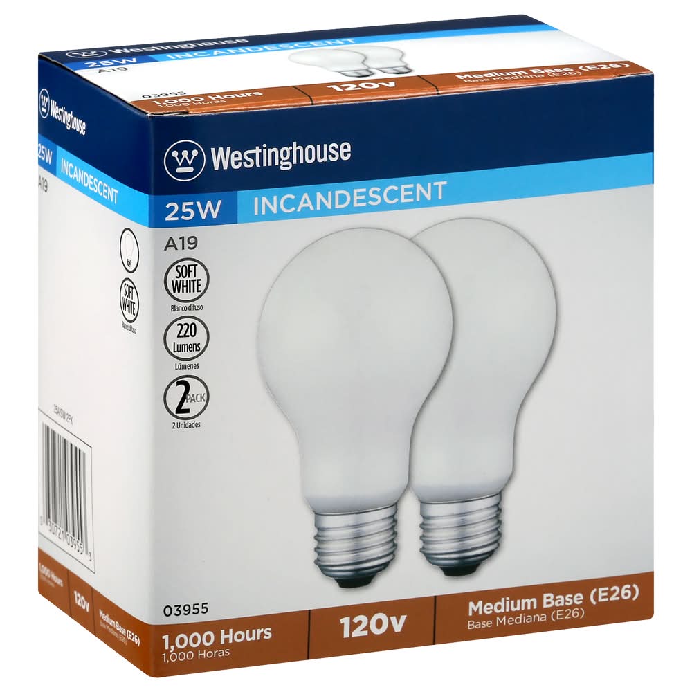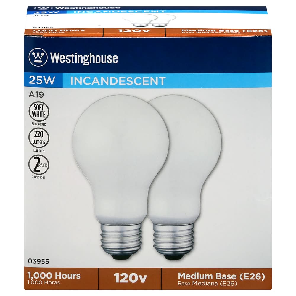 Light Bulbs, Incandescent, Soft White, 25 Watts, 2 Pack WESTINGHOUSE,