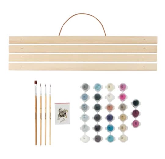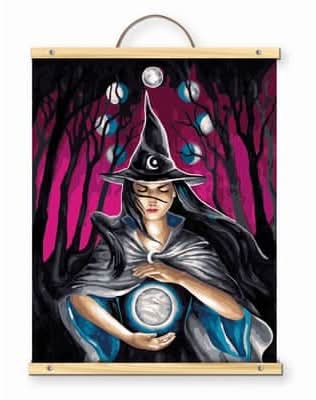 Complete with brushes, numbered paint pots, a pre-printed canvas sheet and a wooden hanger for display, this kit has everything needed to paint an image of a witch with her crystal ball. Celestial Witch design. 957 numbered sections. Instruction sheet included. Some assembly required for display hanger.