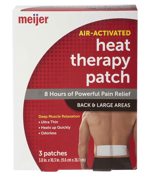 Meijer Heat Therapy Patch is an air-activated product designed to provide pain relief. It is suitable for application on the back and other large areas of the body. The product is available in a convenient patch form.
