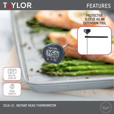 Taylor Digital Instant Read Pocket Thermometer is great for your cooking needs. Digital easy-to-ready display with a temperature range of -40 Degrees Fahrenheight to 302 Degrees Fahrenheit. This Taylor thermometer with a durable stainless steel stem and polycarbonate crystal protected display registers a stable temperature in about 4-7 seconds. Thermometer comes with a sleeve for easy storage. Batteries included.