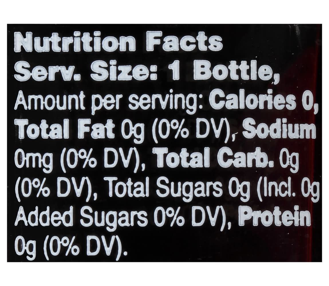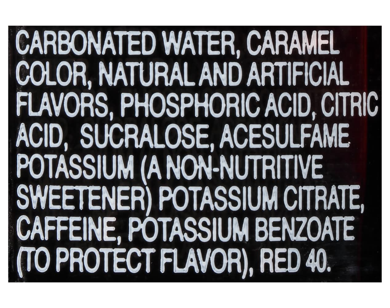 Contains: Carbonated Water, Caramel Color, Natural and Artificial Flavors, Phosphoric Acid, Citric Acid, Sucralose, Acesulfame Potassium (a Non-Nutritive Sweetener) Potassium Citrate, Caffeine, Potassium Benzoate (to Protect Flavor), Red 40