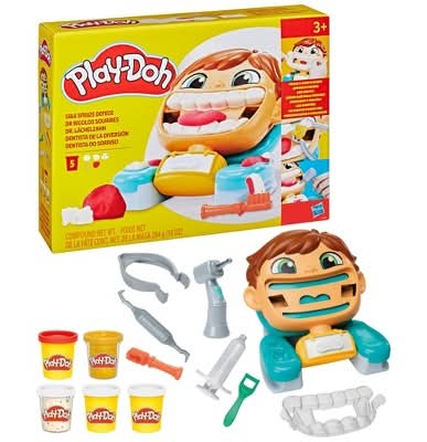 It's time to make an appointment with the Play-Doh Silly Smiles Dentist Kit! Sensory toys get even more hands-on as kids pretend play with the Play-Doh tools. Press and shape Play-Doh teeth and give the patient a checkup. Drill and fill the patient's teeth with the pretend drill, pick, and syringe. Squeeze Play-Doh toothpaste from the toothbrush and extract teeth with the tweezers. Kids are also sure to love making the patient stick out his silly tongue! This Play-Doh set makes a great gift for 3 year olds and up. PLAY-DOH and HASBRO and all related trademarks and logos are trademarks of Hasbro, Inc. Includes dentist playset, tooth mold, tweezers, pick, flosser, toothbrush, drill, syringe, and 5 cans of Play-Doh Ages 3 years and up Notice to Parents: Contains Wheat. Adult assembly required. Compound not intended to be eaten. To clean, allow to dry, then scrape or vacuum. Molded results vary depending on child’s age and level of skill.