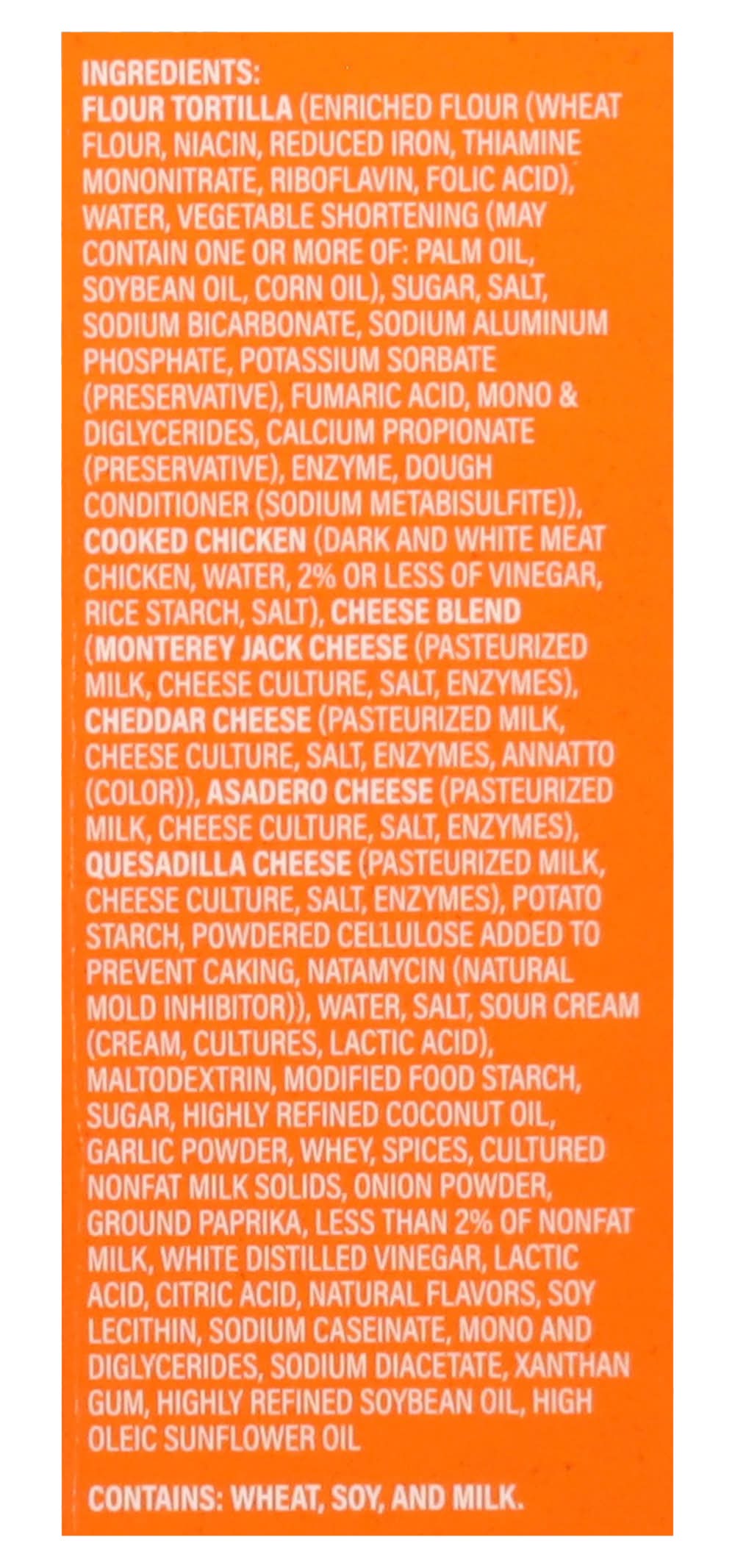 Flour Tortilla (Enriched Flour (Wheat Flour, Niacin, Reduced Iron, Thiamine Mononitrate, Riboflavin, Folic Acid), Water, Vegetable Shortening (May Contain One or More of Palm Oil, Soybean Oil, Corn Oil), Sugar, Salt, Sodium Bicarbonate, Sodium Aluminum Phosphate, Potassium Sorbate (Preservative), Fumaric Acid, Mono Diglycerides, Calcium Propionate (Preservative), Enzyme, Dough Conditioner (Sodium Metabisulfite)), Cooked Chicken (Dark and White Meat Chicken, Water, 2% or Less of Vinegar, Rice Starch, Salt), Cheese Blend (Monterey Jack Cheese (Pasteurized Milk, Cheese Culture, Salt, Enzymes), Cheddar Cheese (Pasteurized Milk, Cheese Culture, Salt, Enzymes, Annatto (Color)), Asadero Cheese (Pasteurized Milk, Cheese Culture, Salt, Enzymes), Quesadilla Cheese (Pasteurized Milk, Cheese Culture, Salt, Enzymes), Potato Starch, Powdered Cellulose Added to Prevent Caking, Natamycin (Natural Mold Inhibitor)), Water, Salt, Sour Cream (Cream, Cultures, Lactic Acid), Maltodextrin, Modified Food Starch, Sugar, Highly Refined Coconut Oil Garlic Powder, Whey, Spices, Cultured Nonfat Milk Solids, Onion Powder, Ground Paprika, Less than 2% of Nonfat Milk, White Distilled Vinegar, Lactic Acid, Citric Acid, Natural Flavors, Soy Lecithin, Sodium Caseinate, Mono and Diglycerides, Sodium Diacetate, Xanthan Gum, Highly Refined Soybean Oil, High Oleic Sunflower Oil Contains: Wheat, Soybeans, Milk, Sulfites