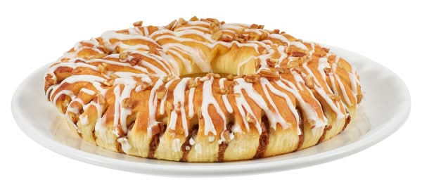 Fresh From Meijer Cinnamon Pecan Coffee Cake Ring is a delightfully aromatic baked good featuring golden brown dough filled with spicy cinnamon. It is enhanced with a generous sprinkling of pecans and topped with a drizzle of white icing. Ideal for warming up, it pairs wonderfully with a hot cup of coffee.