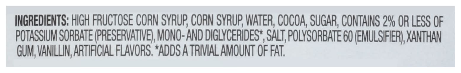 High Fructose Corn Syrup, Corn Syrup, Water, Cocoa, Sugar, Contains 2% or Less of Potassium Sorbate (Preservative), Mono-and Diglycerides (Adds a Trivial Amount of Fat), Salt, Polysorbate 60 (Emulsifier), Xanthan Gum, Vanillin, Artificial Flavors Contains: Corn