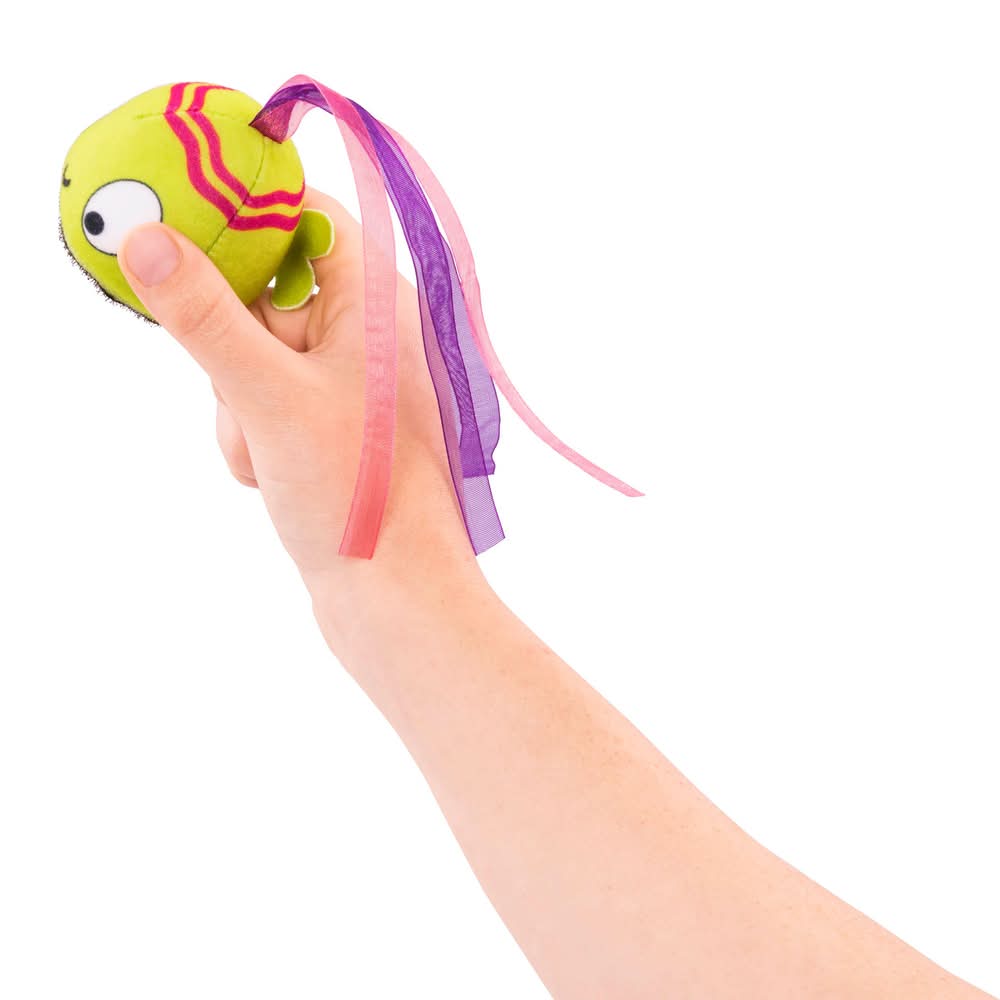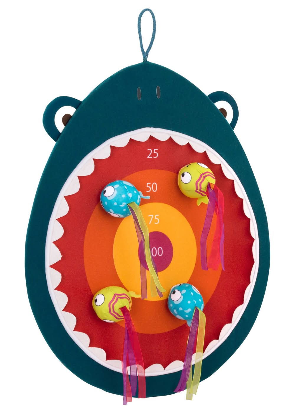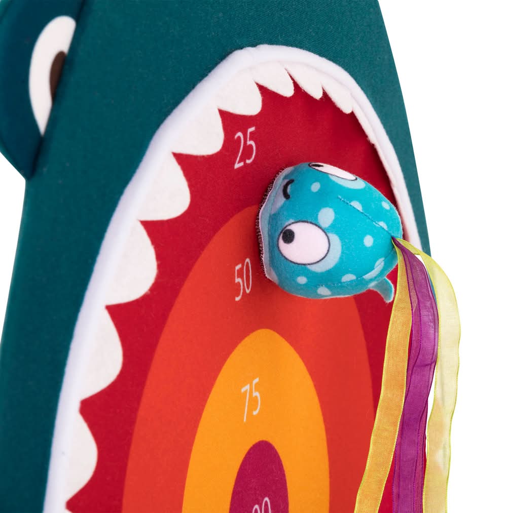 Contenido: 1 tablero de tela con forma de tiburón y 4 peces de felpa con cintas.