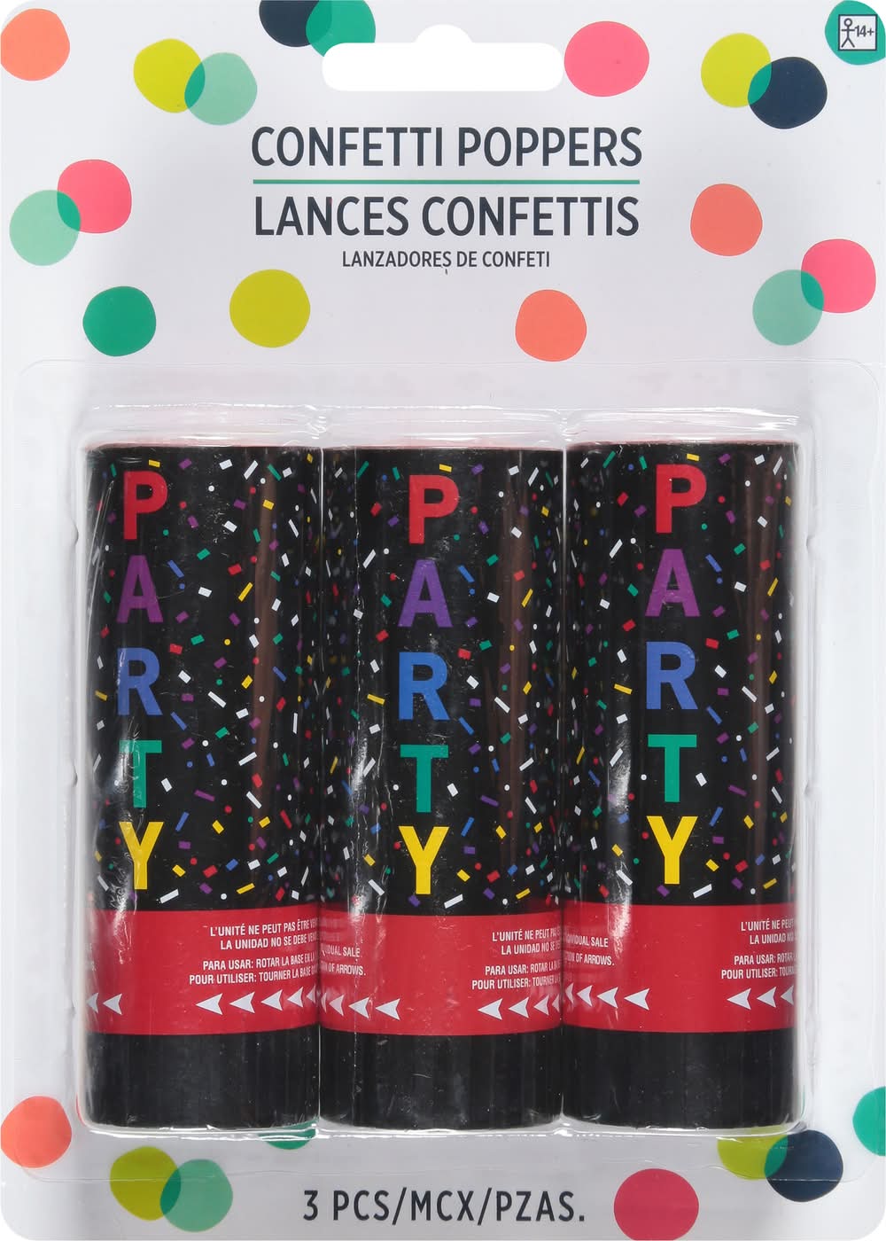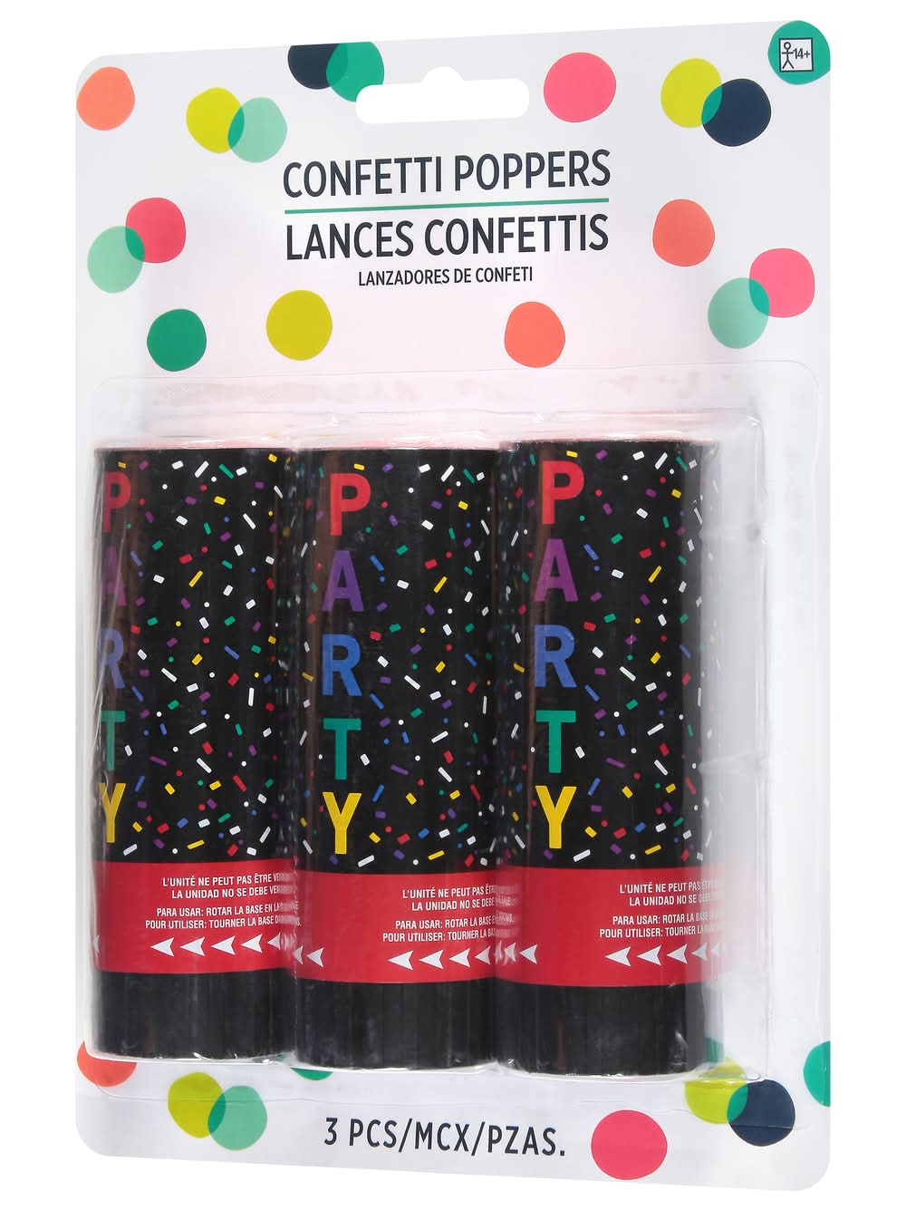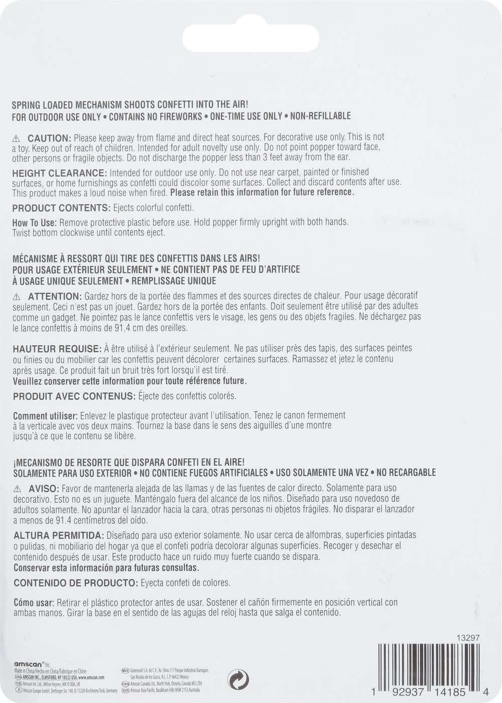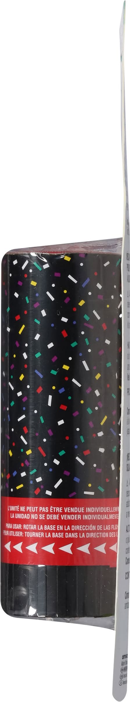14+ Unit not intended for individual sale. Spring loaded mechanism shoots confetti into the air! For outdoor use only. Contains no fireworks. One-time use only. Non-refillable. • Amscan Inc., • Packaging: Reusable