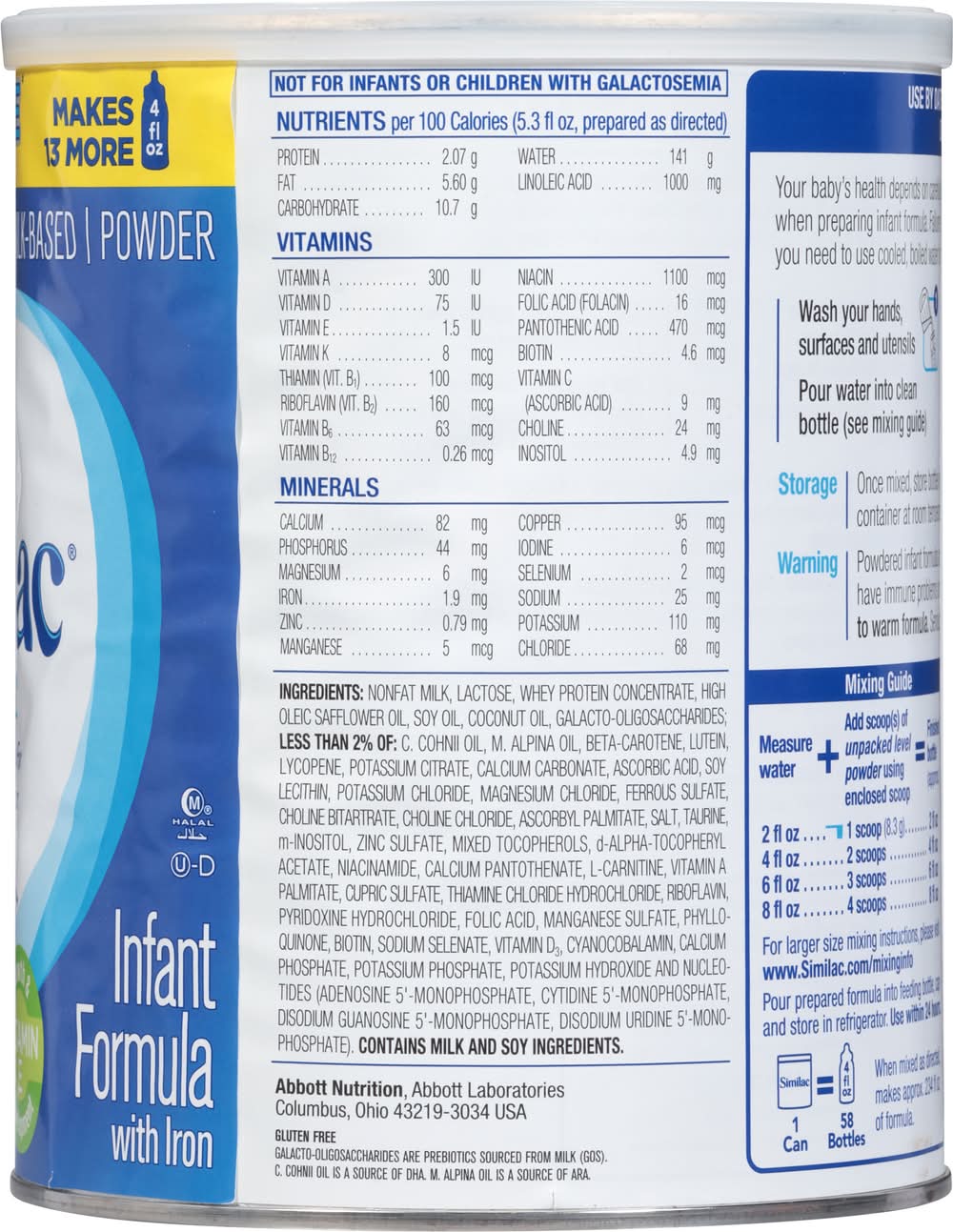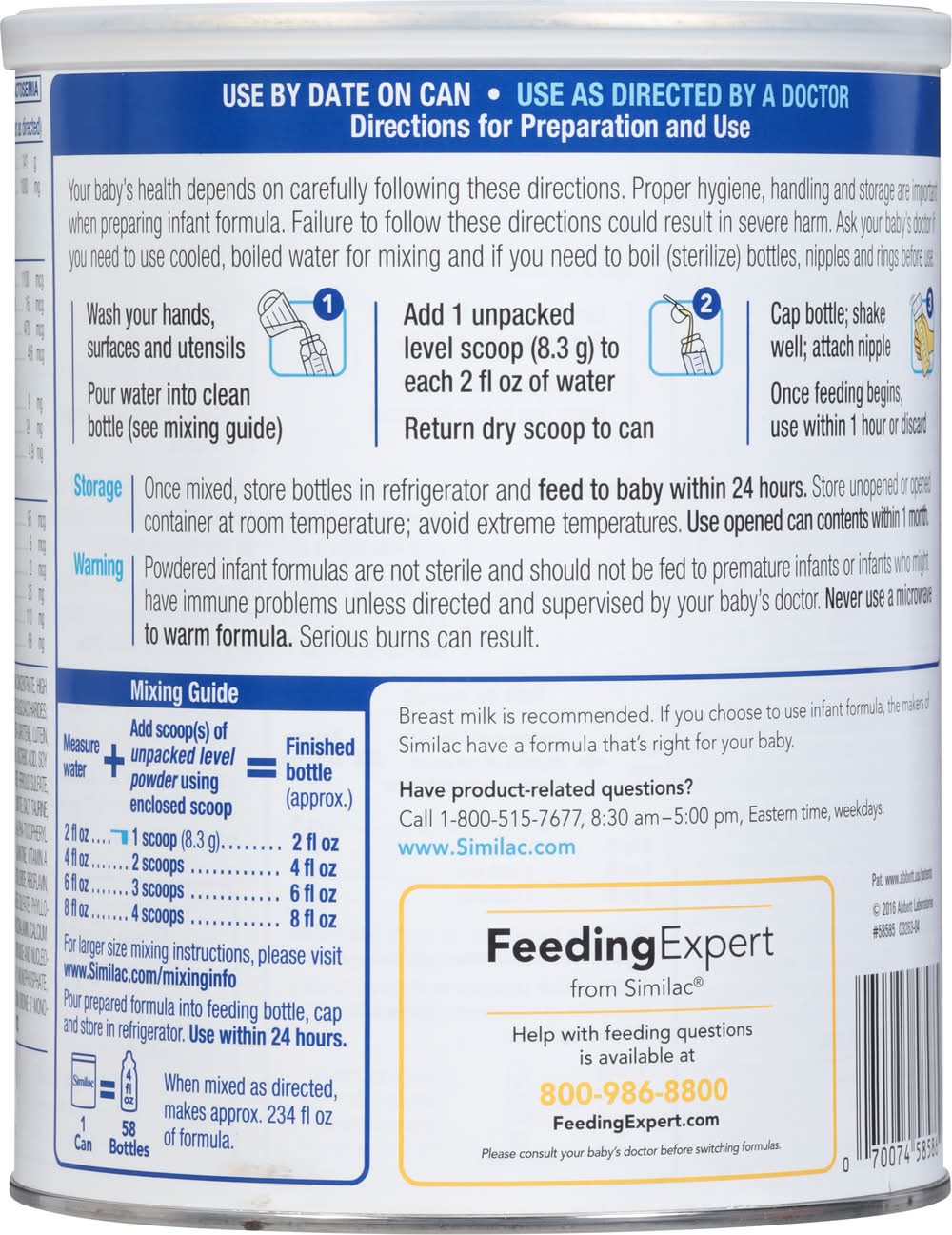 Directions for use: Use as directed by a doctor. Directions for Preparation and Use: Your baby's health depends on carefully following these directions. Proper hygiene, handling, and storage are important when preparing infant formula. Failure to follow these directions could result in severe harm. Ask your baby's doctor if you need to use cooled, boiled water for mixing and if you need to boil (sterilize) bottles, nipples, and rings before use. 1. Wash your hands, surfaces, and utensils. Pour water into a clean bottle (see mixing guide). 2. Add 1 unpacked level scoop (8.7 g) to each 2 fl oz of water. Return dry scoop to can. 3. Cap bottle; shake well; attach nipple. Once feeding beings, use within 1 hour or discard. Mixing Guide: Measure Water: 2 fl oz + Add scoop(s) of unpacked level powder using enclosed scoop: 1 scoop (8.7 g); Measure Water: 4 fl oz + Add scoop(s) of unpacked level powder using enclosed scoop: 2 scoops; Measure Water: 6 fl oz + Add scoop(s) of unpacked level powder using enclosed scoop: 3 scoops; Measure Water: 8 fl oz + Add scoop(s) of unpacked level powder using enclosed scoop: 4 scoops. Each scoop adds about 0.2 fl oz to the amount of prepared formula. For larger size mixing instructions, please visit www.similac.com/mixinginfo When mixed as directed, makes approx. 224 fl oz of formula. Storage: Once mixed, store bottles in refrigerator and feed to baby within 24 hours. Store unopened or opened container at room temperature; avoid extreme temperatures. Use opened can contents within 1 month. Use by date on can. Storage recommendation: Storage: Once mixed, store bottles in refrigerator and feed to baby within 24 hours. Store unopened or opened container at room temperature; avoid extreme temperatures. Use opened can contents within 1 month.