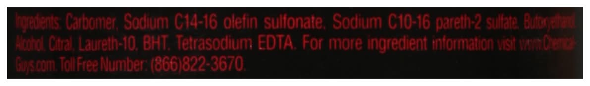 Carbomer, Sodium C14-16 Olefin Sulfonate, Sodium C10-16 Pareth-2 Sulfate, Butoxyethanol Alcohol, Citral Laureth-10, BHT, Tetrasodium EDTA