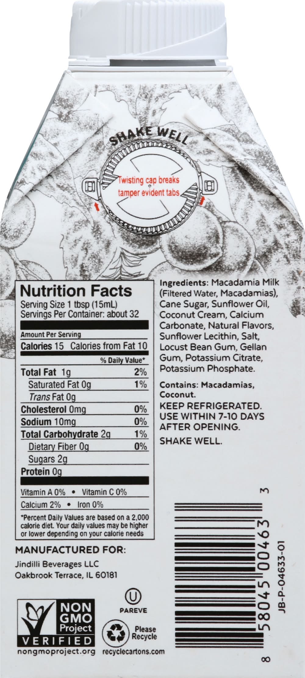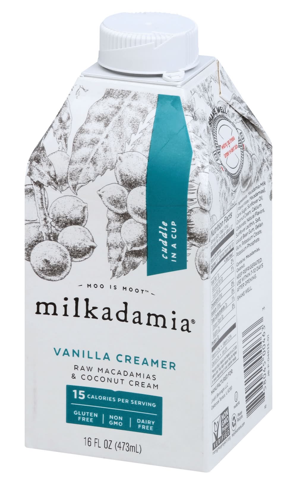 Macadamia Milk (Filtered Water, Macadamias), Cane Sugar, Sunflower Oil, Coconut Cream, Calcium Carbonate, Natural Flavors, Sunflower Lecithin, Salt, Locust Bean Gum, Gellan Gum, Potassium Citrate, Potassium Phosphate. Contains: Tree Nuts Additives: None